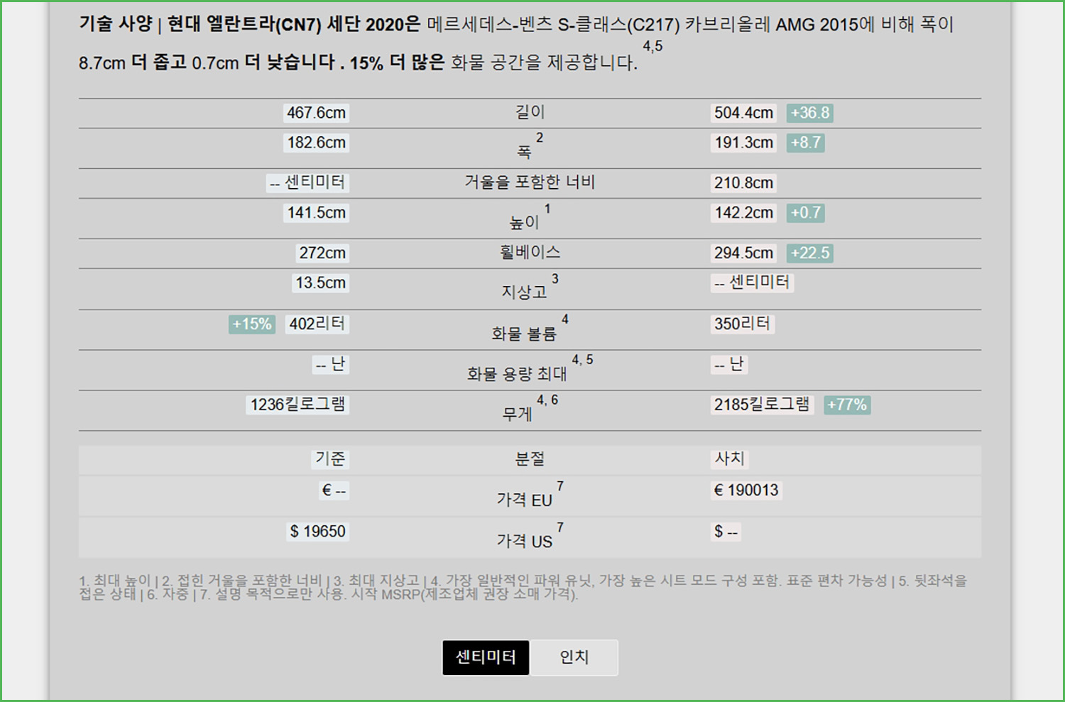 그리고 기본적인 가격이 표시 되어 있기도 하고, 센치티터와 인치로 조절이 가능하기 때문에 원하는 단위로 볼 수도 있습니다. 크게 부분에 있어서 자동차 비교가 필요한 경우 해당 사이트가 유용할 수 있겠습니다.