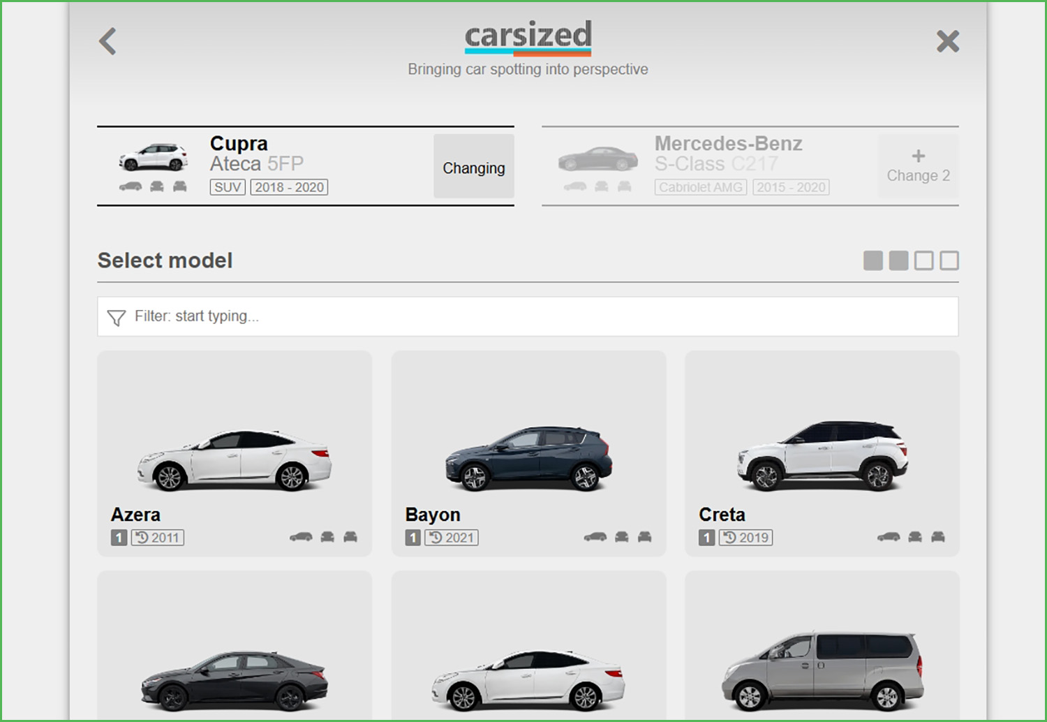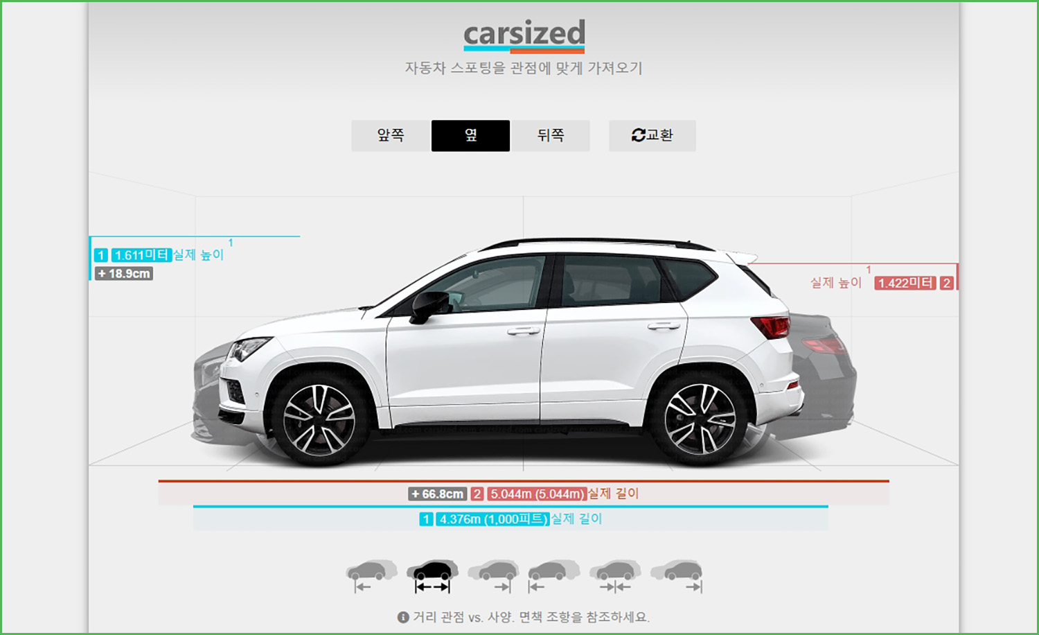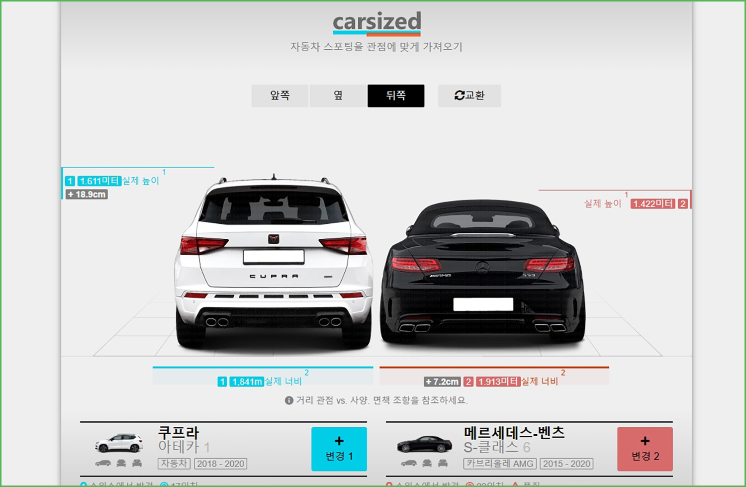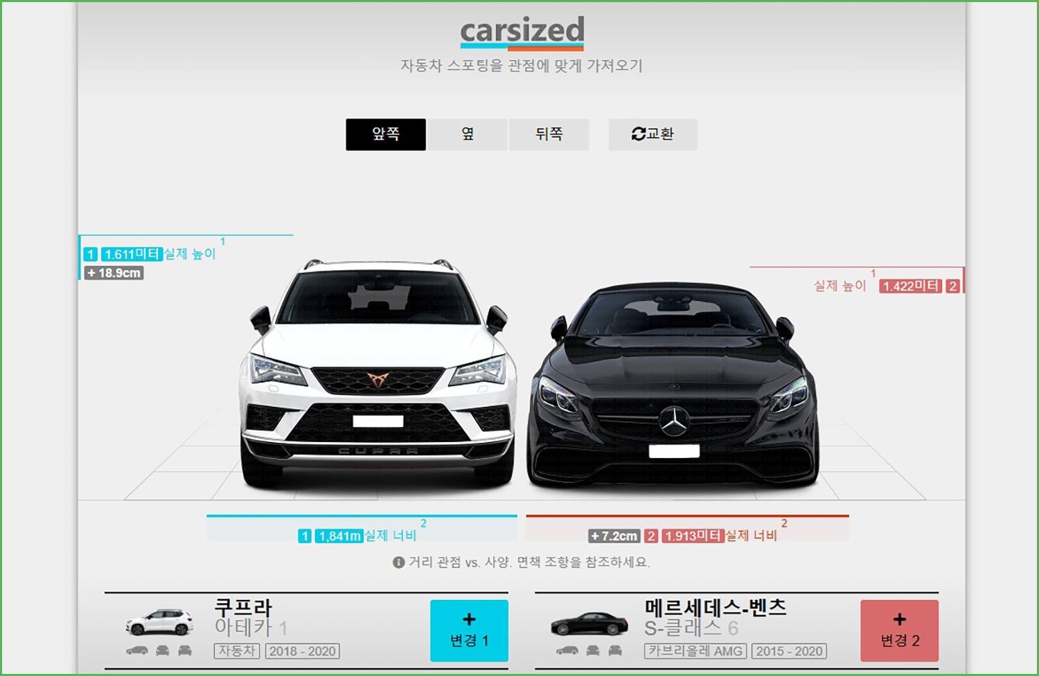 carsize(카-사이즈)라고 검색을 하시면 찾으실 수 있습니다. 한글말고 영어로 해야 찾기 쉽습니다. 너무나 직관적인 사이트명입니다. 차량의 크기를 비교해 주는 사이트로 자동차 이미지를 겹쳐서 정확하게 눈으로 확인할 수 있습니다. 단순히 숫자로 표기된 제원은 감이 안 올 수 있는데 이미지로 확인 가능하니 비교가 확실하게 됩니다.(귀찮으시면 위 버튼을 누르시면 바로 이동됩니다.)