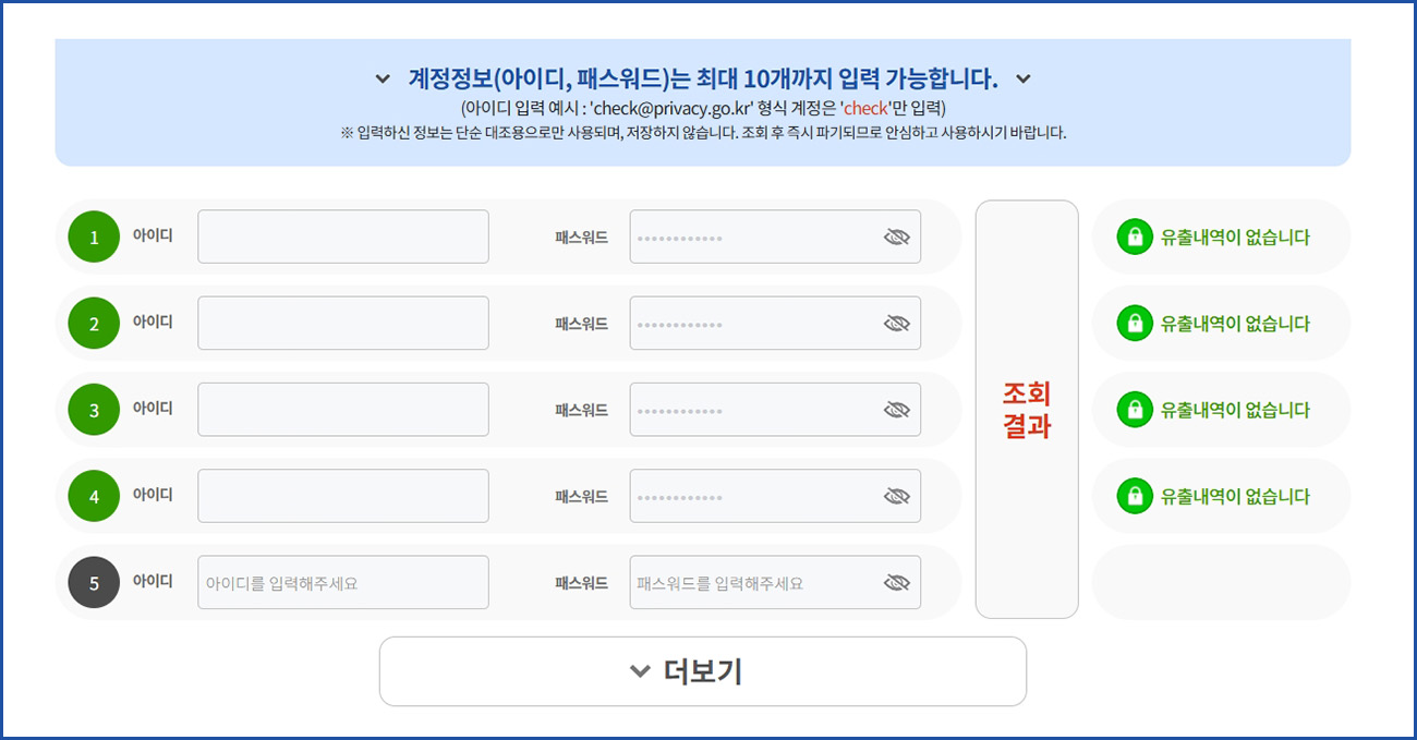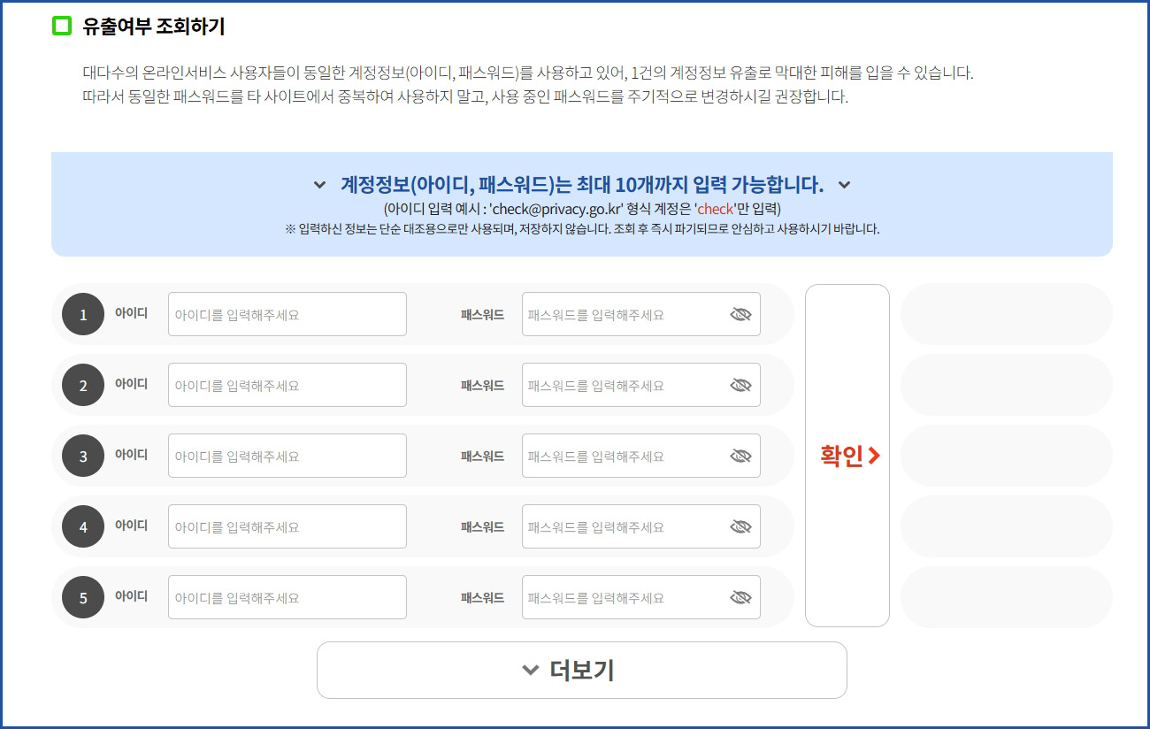 사용 중인 아이디와 비밀번호를 입력합니다. 같은 아이디여도 비밀번호가 다를 수 있기 때문에 여러가지로 넣어 봅니다. 의심이 가는 아이디/비번을 입력 후 확인을 누르면 바로 조회 결과가 나옵니다. 유출 내역이 없습니다.가 나온다면 안전한 상태이지만, 그렇지 않다면 비밀번호를 바꾸는 것이 좋습니다.