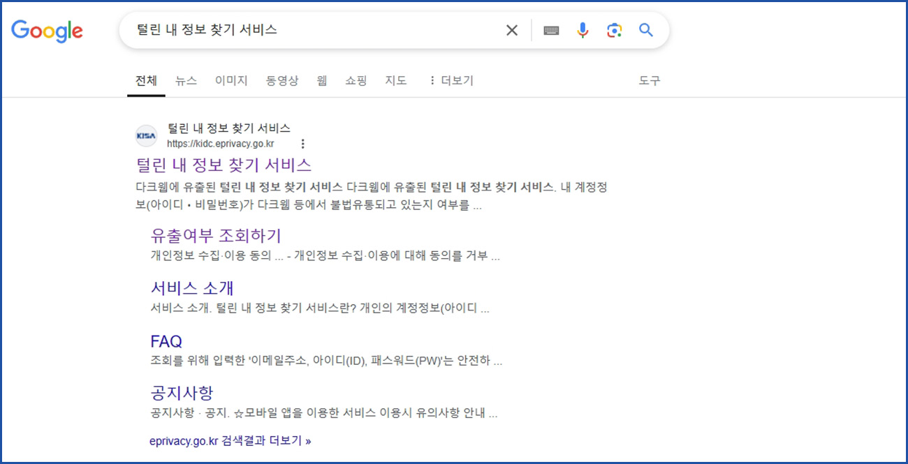 내 정보 찾기 서비스 검색 > 유출여부 조회하기 클릭 > 1차 사용자 인증(이메일 입력 후 인증번호 확인) > 2차 인증(로봇이 아닙니다 체크 확인) > 의심스러운 사용 중인 아이디와 비밀번호 입력 후 확인 > 유출내역 확인