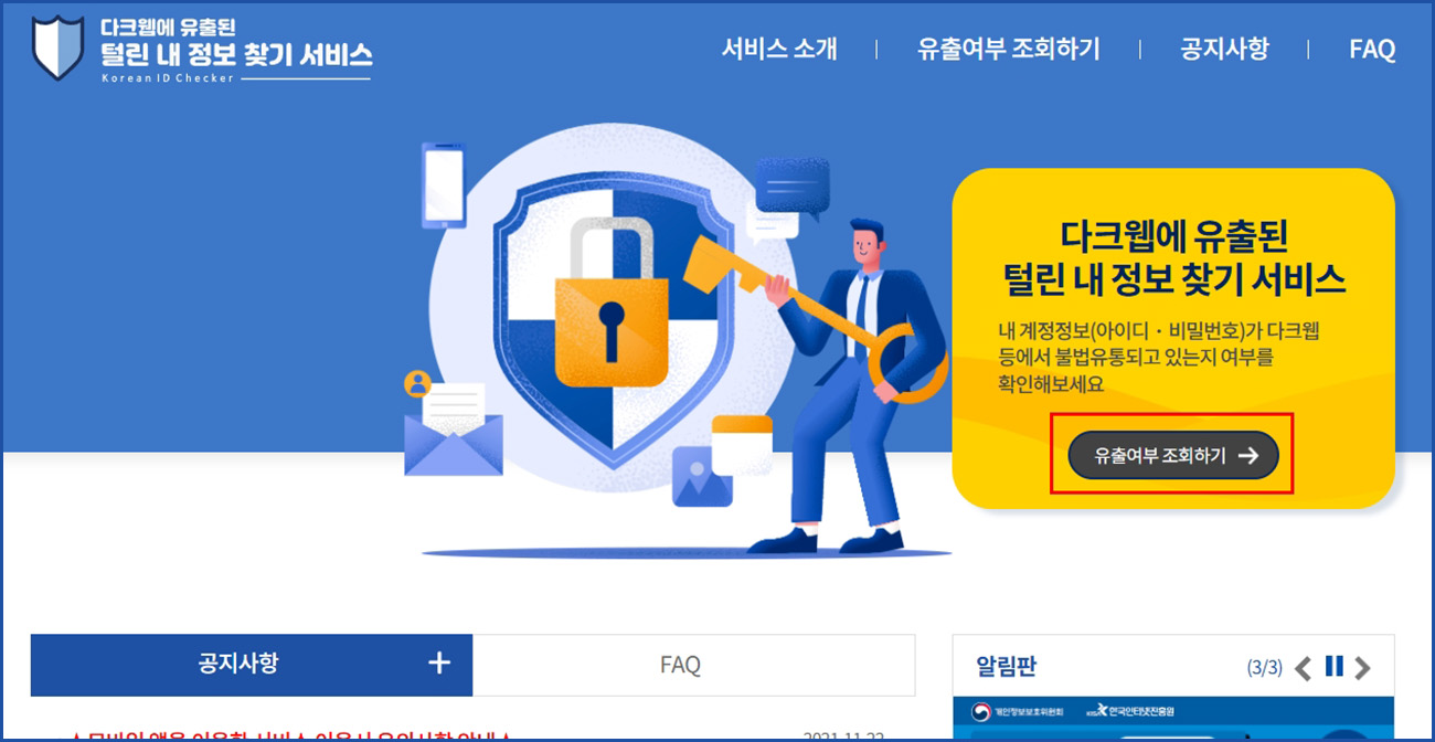 검색 사이트에서 털린 내 정보 찾기 서비스를 검색하고, 접속하게 되면 보이는 노란색 상자의 유출 여부 조회하기를 클릭합니다. 다크웹 등에서 불법 유통되고 있는지 여부를 간단한 절차를 통해서 확인해 볼 수 있습니다.