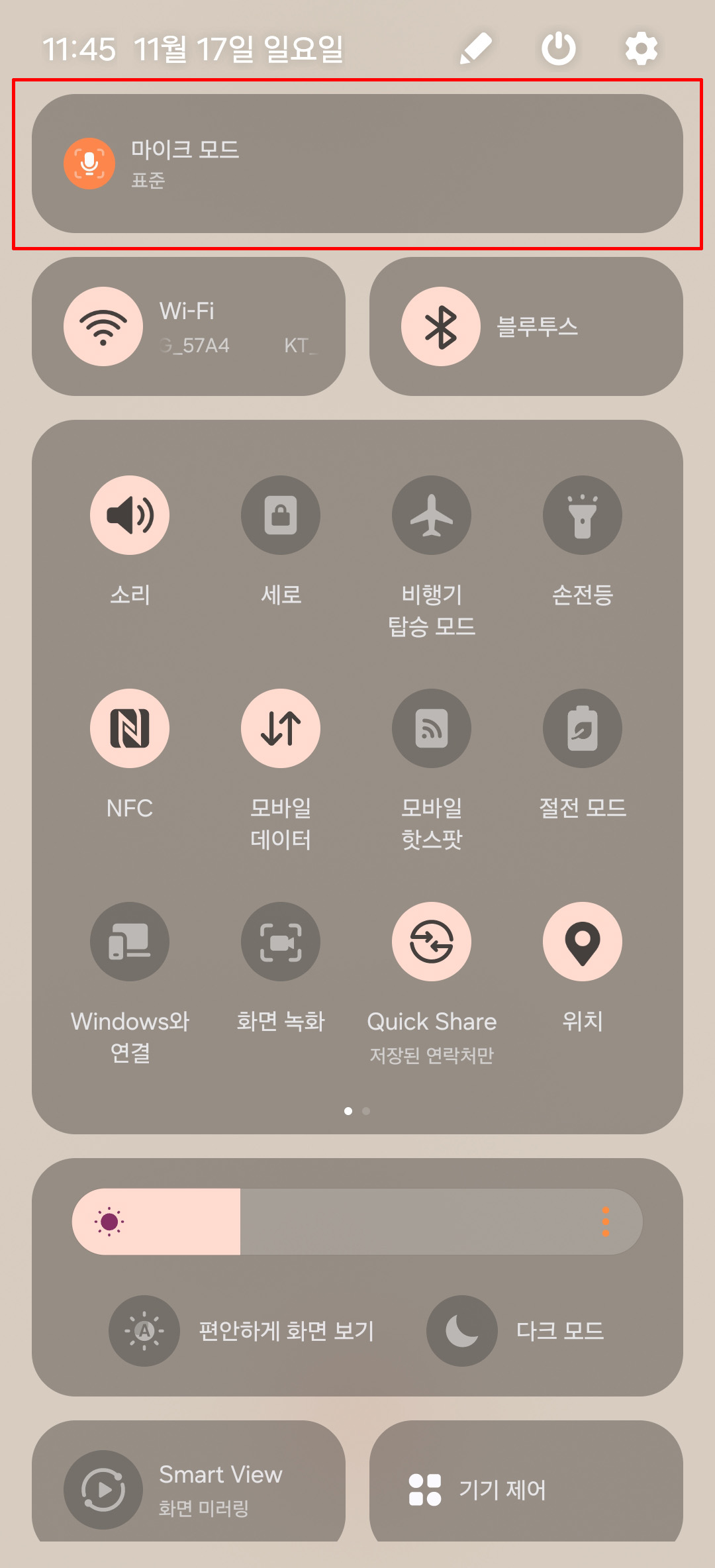 일단, 통화 중인 상태에서 설정창이 내려 오도록 위에서 아래로 쓸어내리면 되는데요. 이렇게 하면 제일 상단에 마이크 모드가 나타납니다.