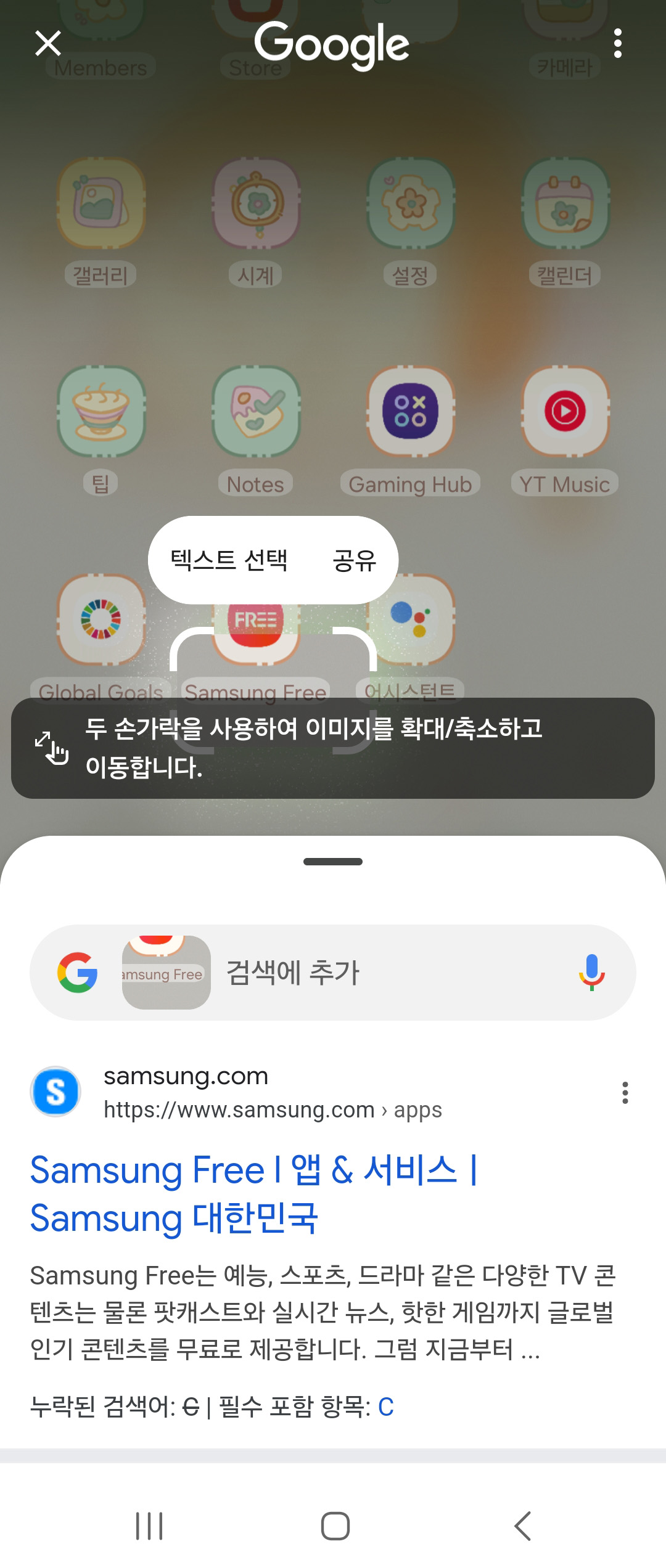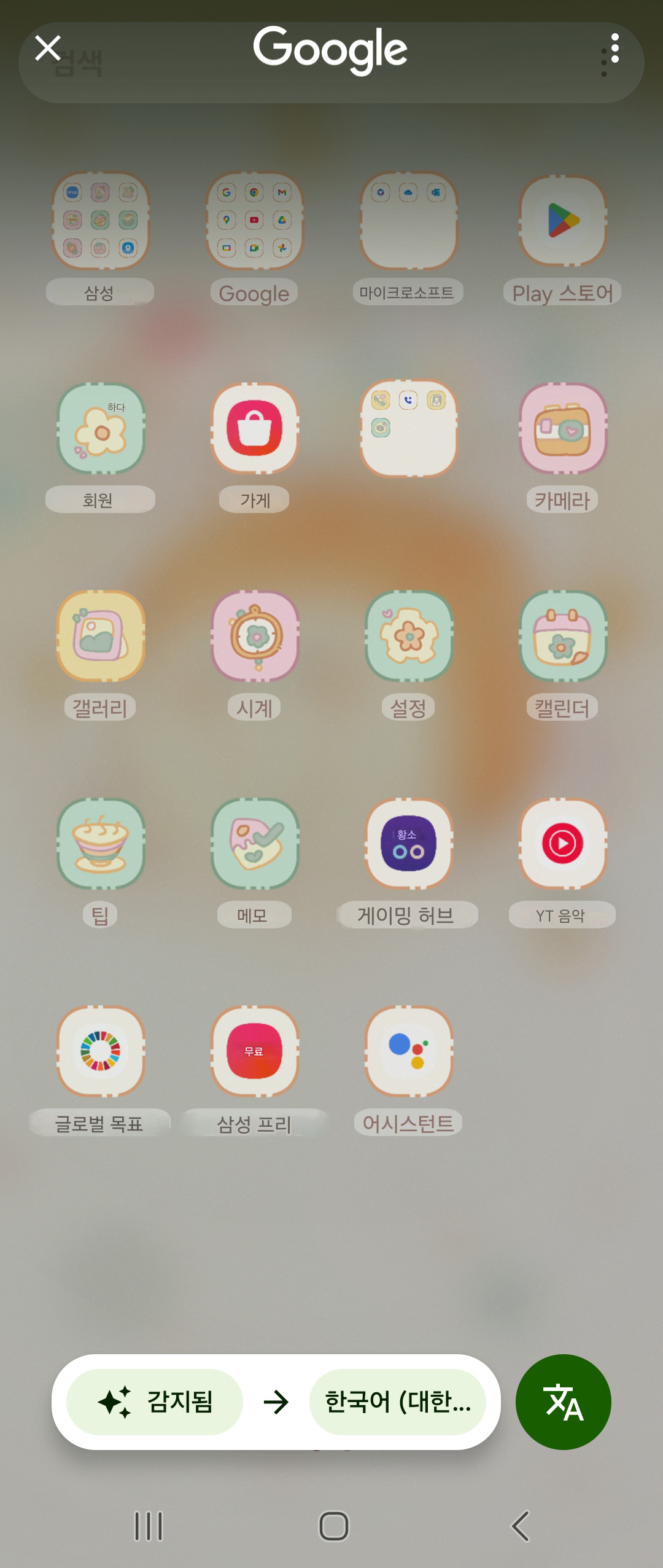 하단의 가운데 보면 네모동글한 모양의 아이콘이 있는데요. 홈버튼입니다. 누르게 되면 휴대폰 내 화면에서 홈으로 돌아가죠. 그런데 이 버튼을 가만히 누르고 있으면 하단에 구글 창이 뜨는데요. 이 때 원하는 부분만 드래그해서 영역을 설정하면 해당 부분을 구글을 통해 검색을 한다거나 번역을 할 수 있습니다.