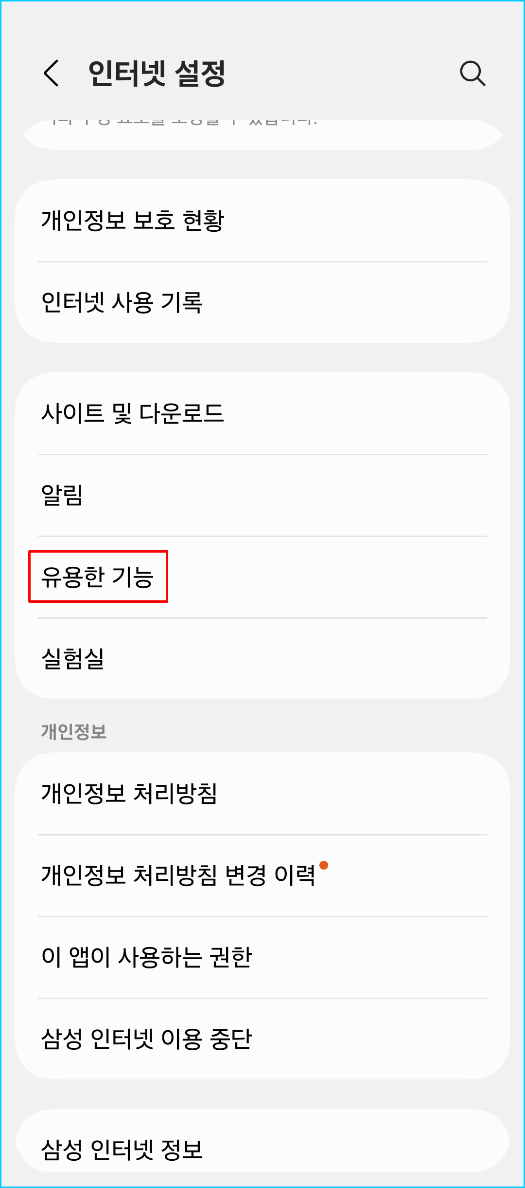 삼성 인터넷 앱 실행 > 우측 하단 3선 클릭 > 설정 클릭(인터넷 설정) > 유용한 기능
