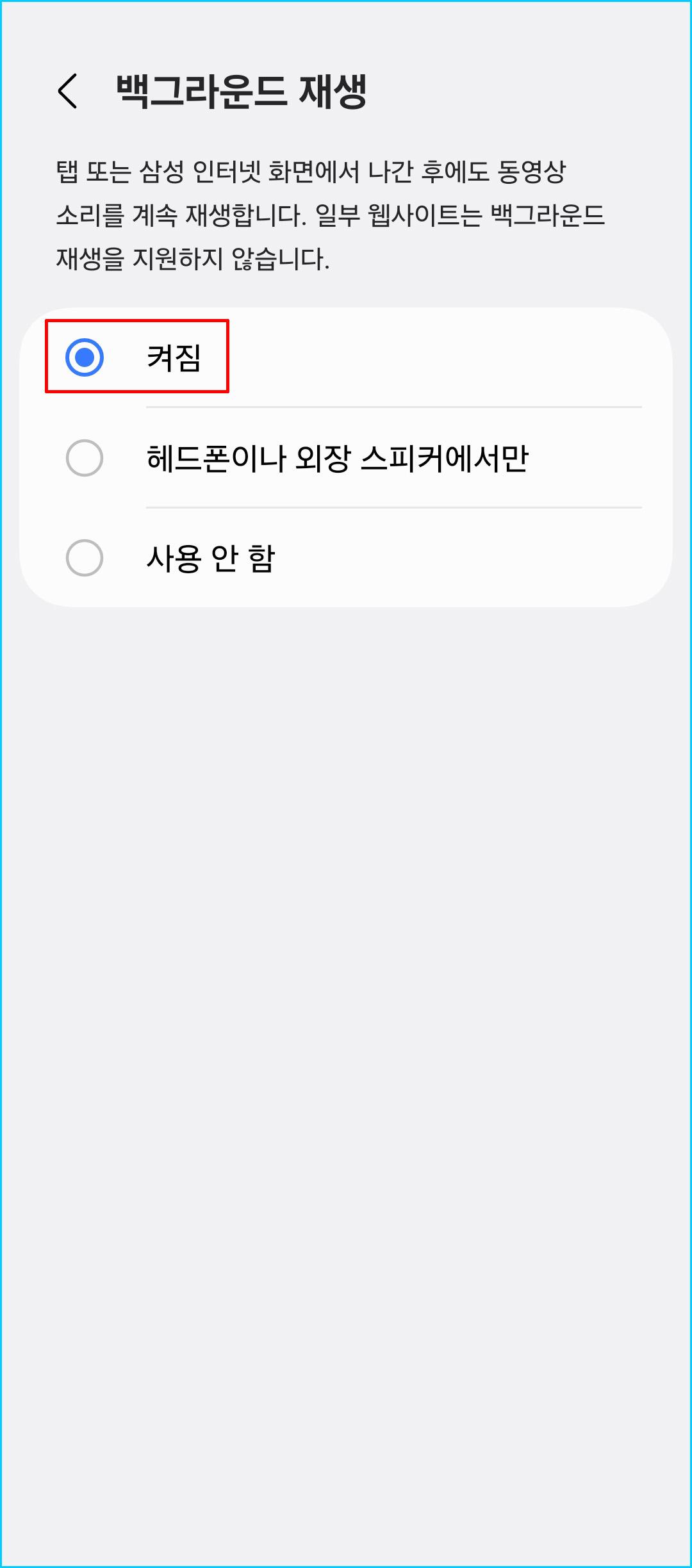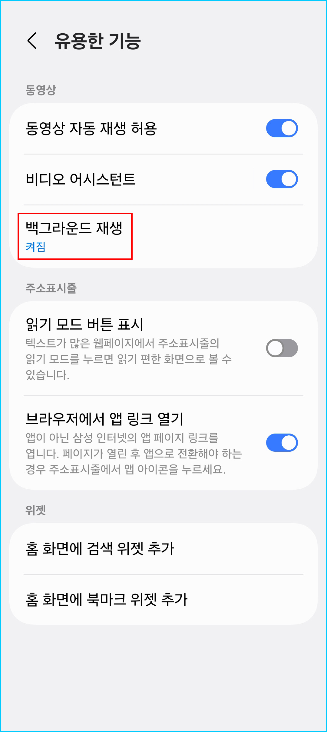 유용한 기능 > 백그라운드 재생 > 켜짐