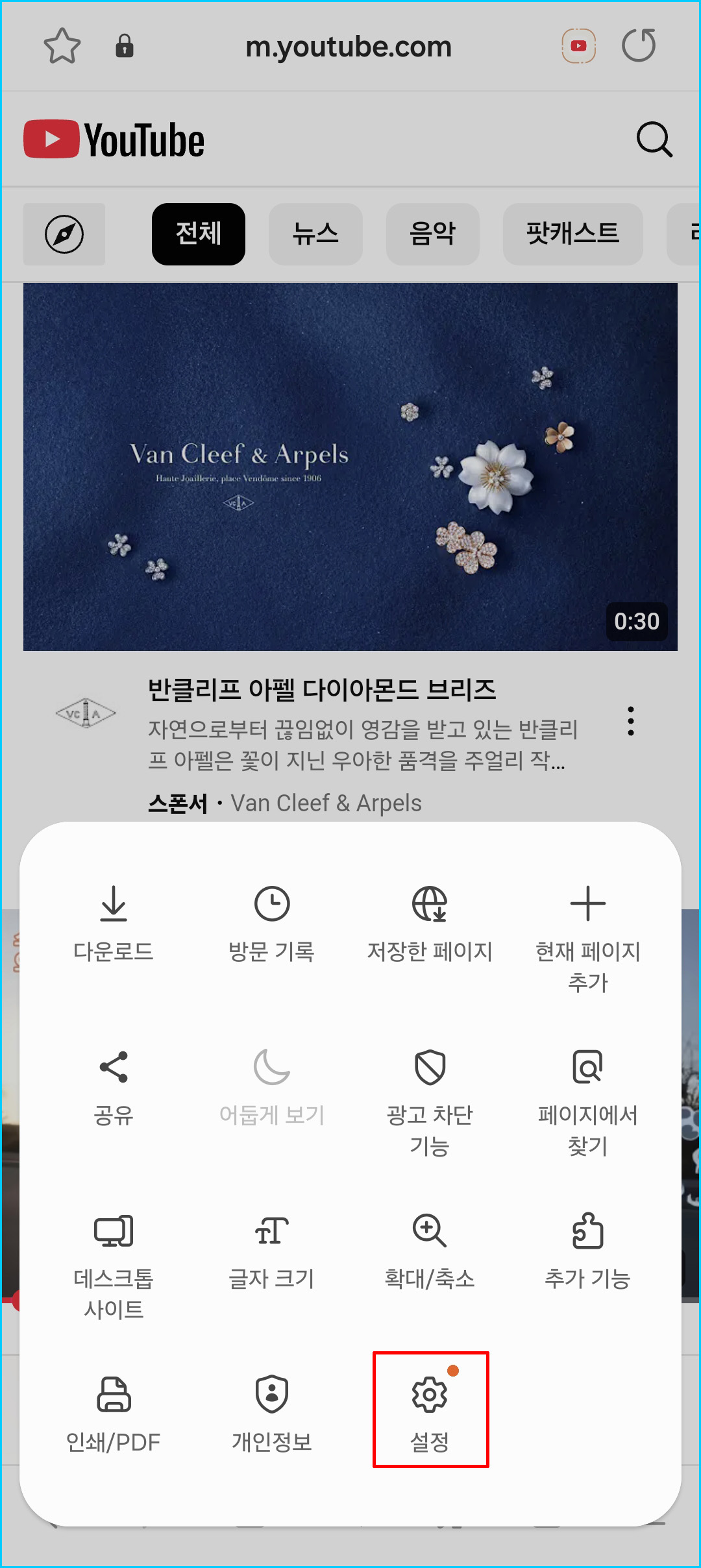 삼성 갤럭시를 사용하신다면 인터넷이라는 앱이 있습니다.(구글 크롬 아님) 삼성 인터넷을 실행 시키고, 우측 하단의 3선을 누르면 설정 버튼을 확인하실 수 있습니다. 클릭 후에 유용한 기능으로 들어가 줍니다.