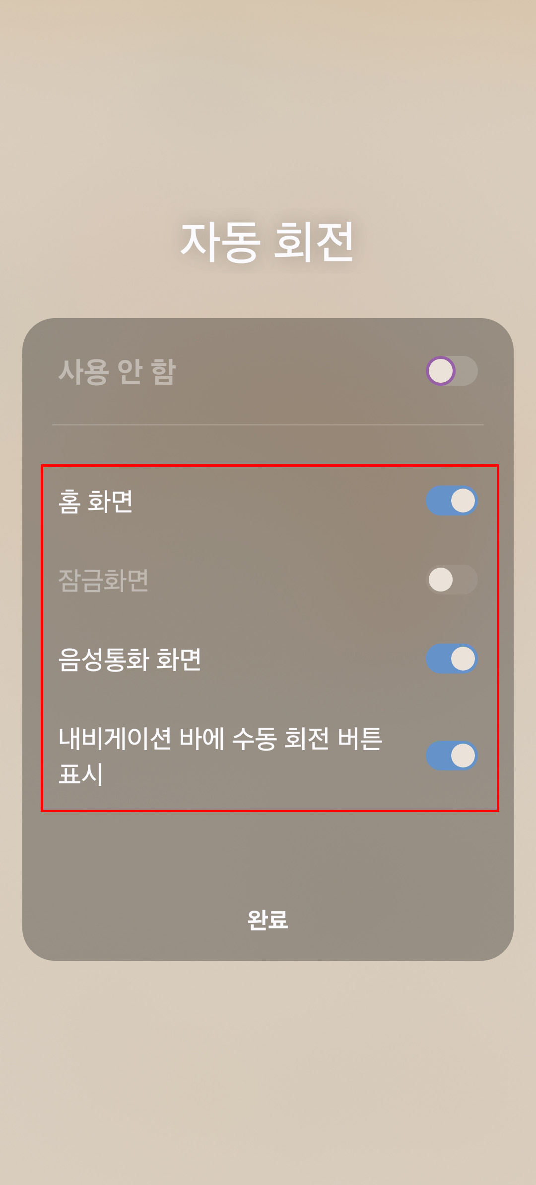 잠금화면은 고정이라 설정이 안되고, 홈 화면과 음성토화 화면 시 자동회전이 되도록 할지를 결정할 수 있습니다.
