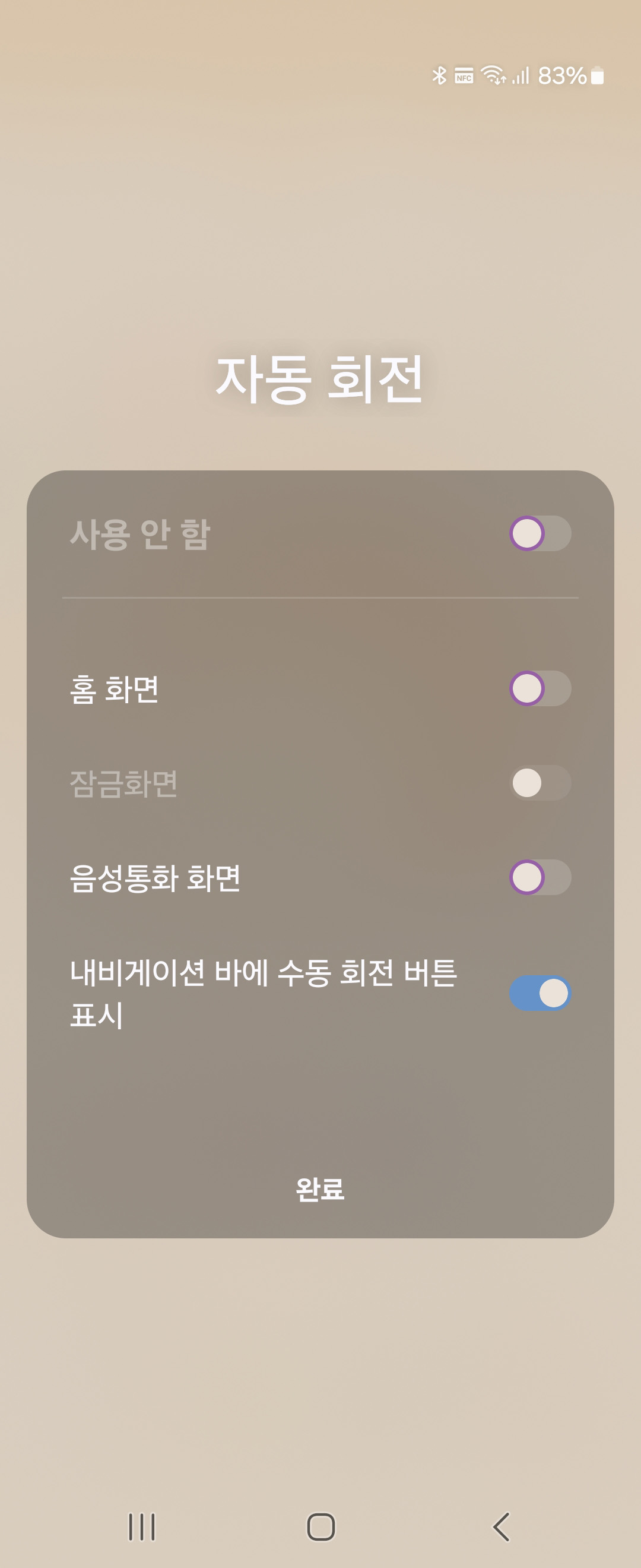 홈화면, 음성통화 화면, 내비게이션 바에 수동 회전 버튼 표시까지 원하는 곳에만 적용 시킬 수 있습니다. 사용 안 함으로 설정하게 되면 전체를 다 사용하지 않는 것이 되는 것이지만, 사용 안 함을 클릭하고, 원하는 것만 별도로 ON 상태로 만들어주면 원하는 때에만 자동회전이 적용되며, 반대로 사용 중으로 하고, 원하지 않는 것만 끌 수도 있습니다.