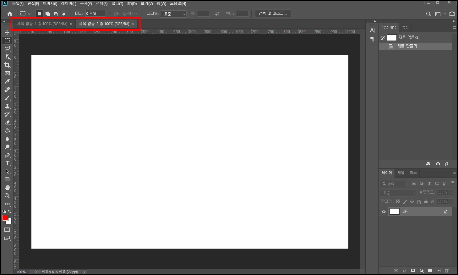 '탭으로 문서 열기'를 해제하면 새로운 이미지를 불러오거나 새로 만들기로 창을 띄워도 탭으로 묶이지 않습니다. 기본 세팅이 탭으로 문서 열기로 되어 있기 때문에 해당 옵션을 모르면 답답할 수 있는데, 알고나면 참 간단 합니다.