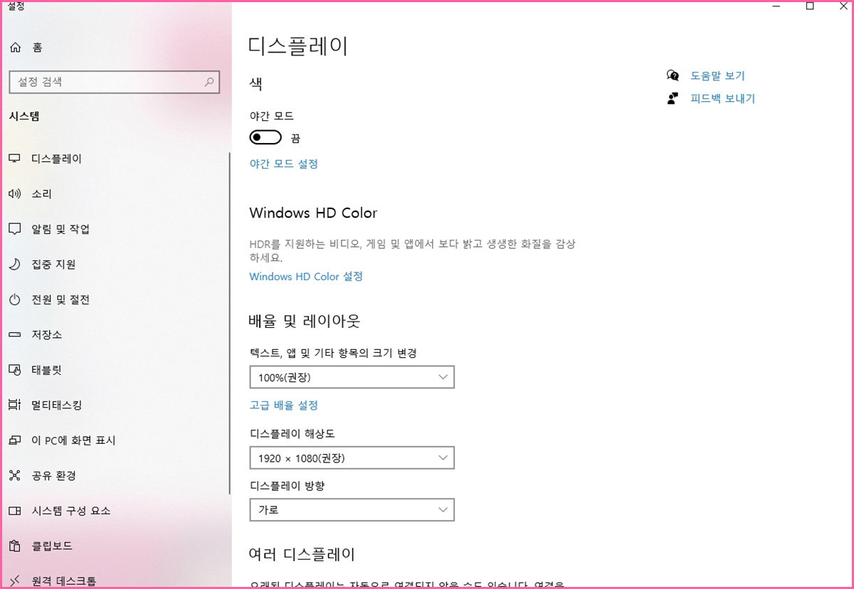 이런식으로 진행해서 아이콘의 크기를 줄일 수도 있지만, 화면 배율 전체가 작아지거나 커지기 때문에 보여지는 화면 자체가 배율이 맞지 않고, 이상해 집니다. 그래서 보통은 권장하는 상태를 유지하게 되죠.