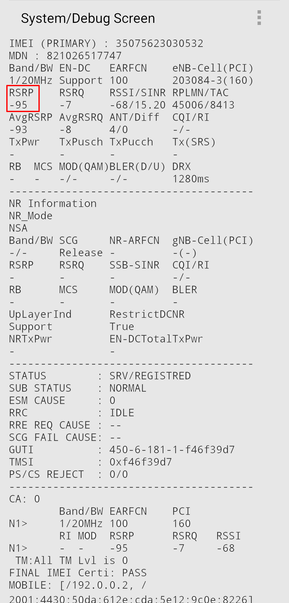 안드로이드 폰 기준 *123456# (아이폰 : *3001#12345#*)을 입력하시면 다음과 같은 창이 뜹니다. 여기서 RSRP 부분의 숫자를 확인하시면 되는데요.숫차가 높을 수록 데이터 수신 상태가 좋지 않다고 보시면 됩니다. -110이상인 경우에는 통화가 불가능 합니다.