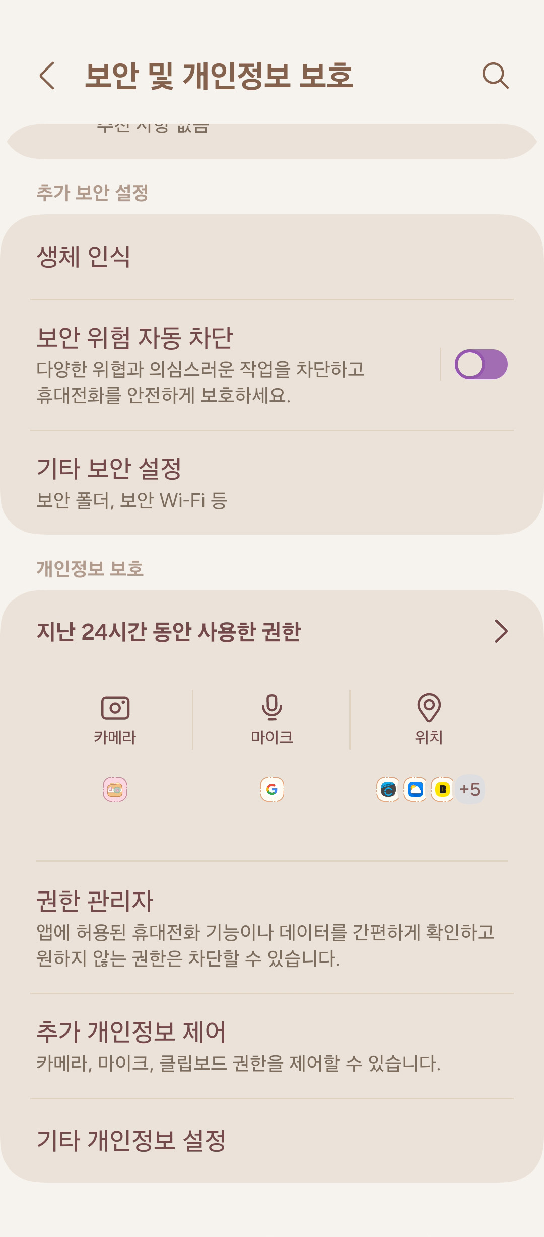 설정 > 보안 및 개인정보 보호 > 추가 보안 설정 > 보안 위험 자동 차단(끄기)