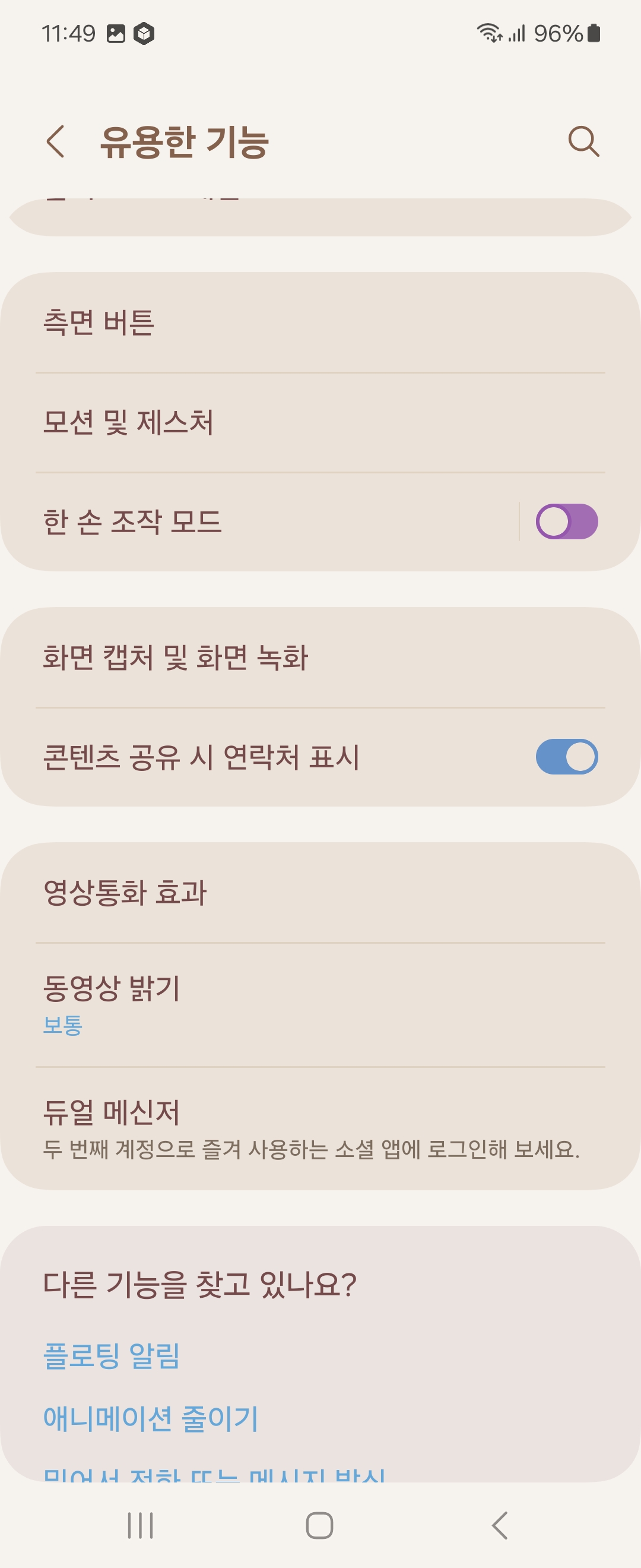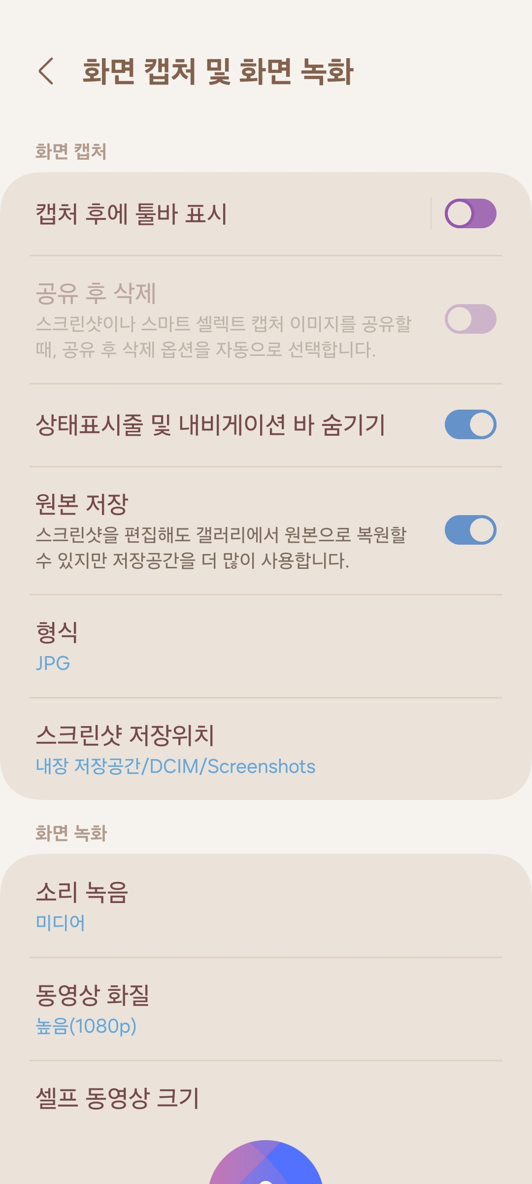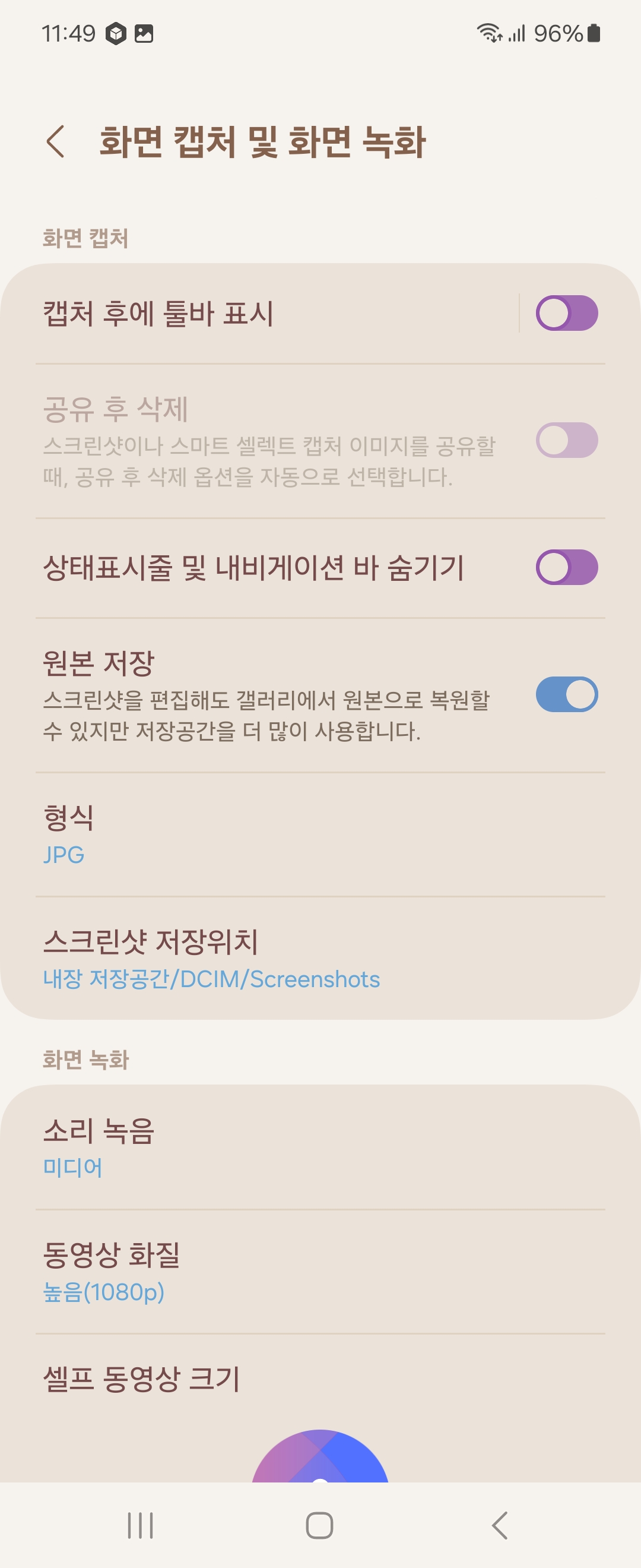 설정 > 유용한 기능 > 화면 캡처 및 화면 녹화 > 화면 캡처 및 화면 녹화 > 상태표시줄 및 내비게이션 바 숨기기