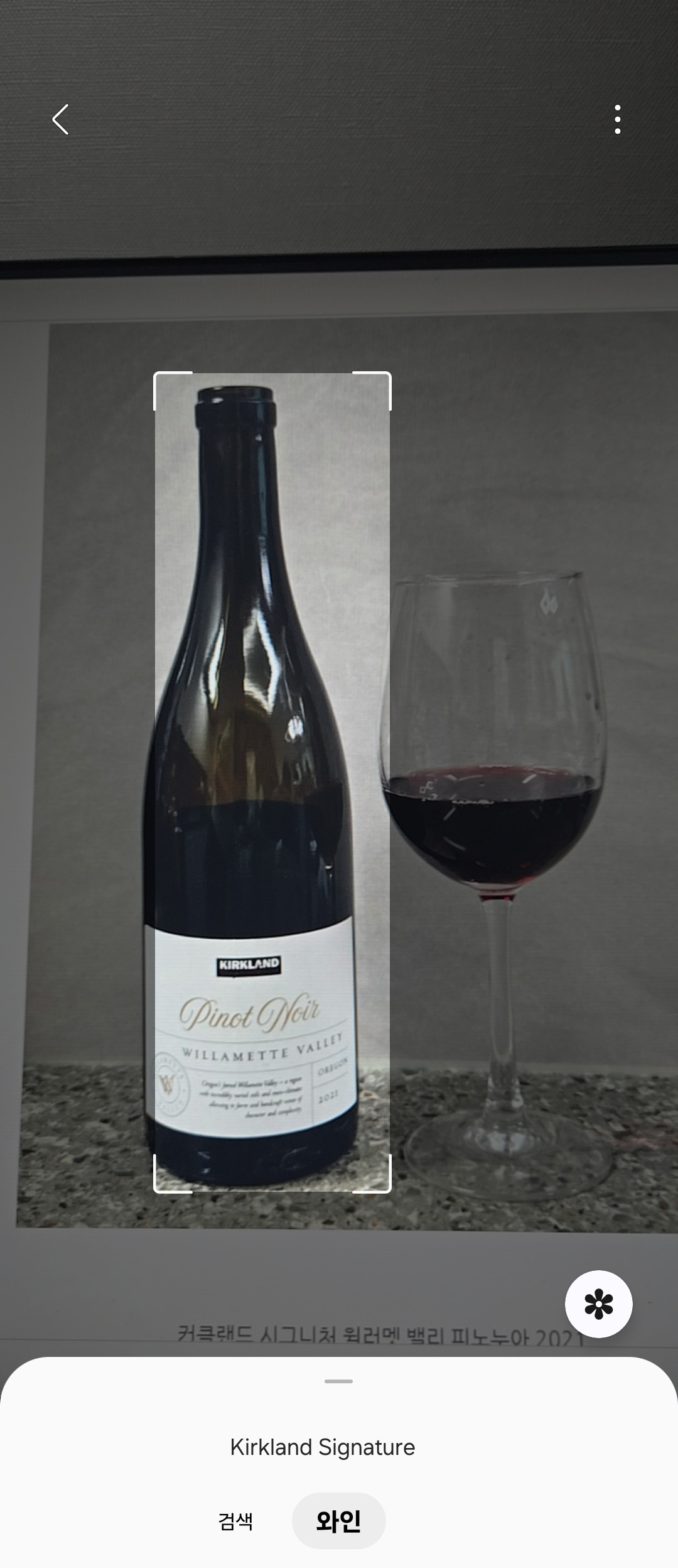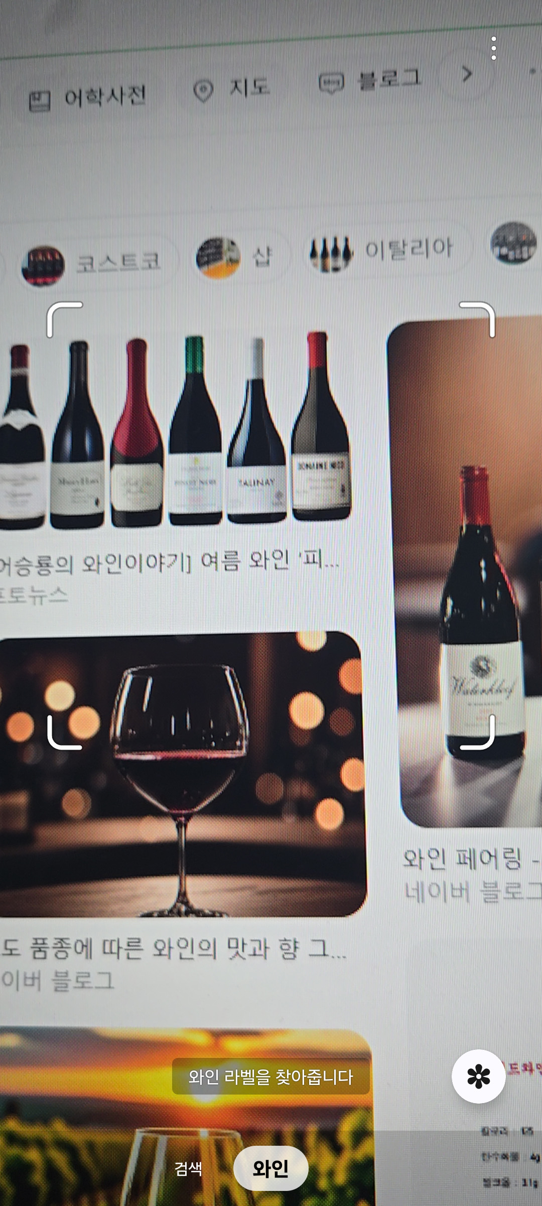 위 단계를 거쳐서 들어가게 되면 와인을 빅스비 비전을 통해서 와인을 검색할 수 있습니다. 실제 와인이 아니라 이미지도 인식을 해서 정보를 찾아주기 때문에 인터넷 상에 있는 와인 사진으로도 정보를 얻으실 수 있습니다. 다만, 인터넷 상에 있는 화면속 이미지는 인식을 잘 못하는 경향이 있어 여러번 시도해야 할 수도 있습니다.