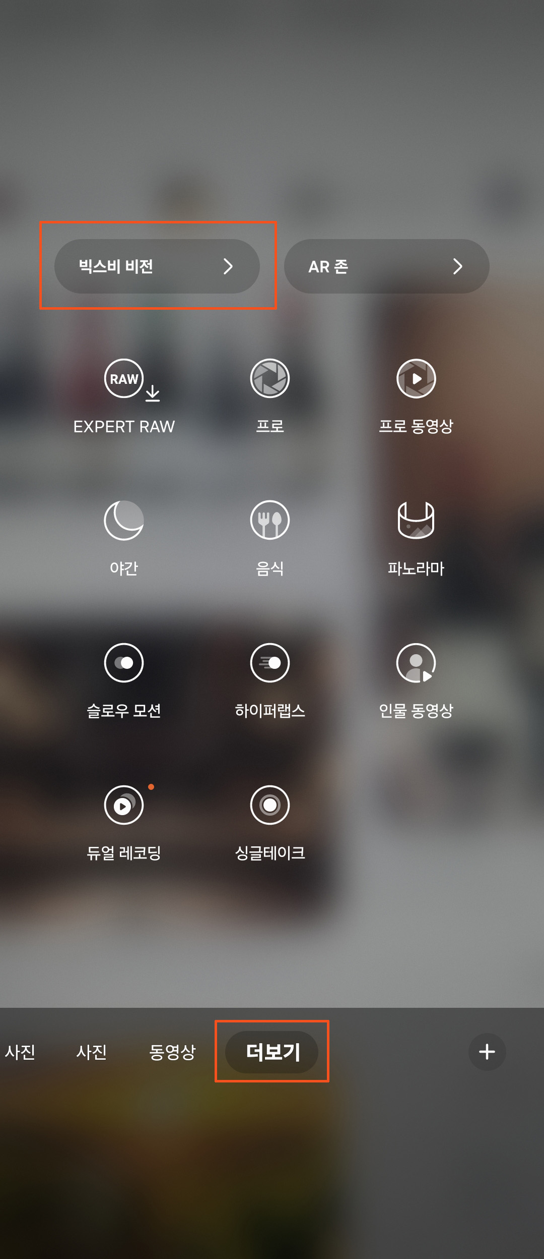 기본 카메라 앱 켜기 > 더보기 > 빅스비 비전