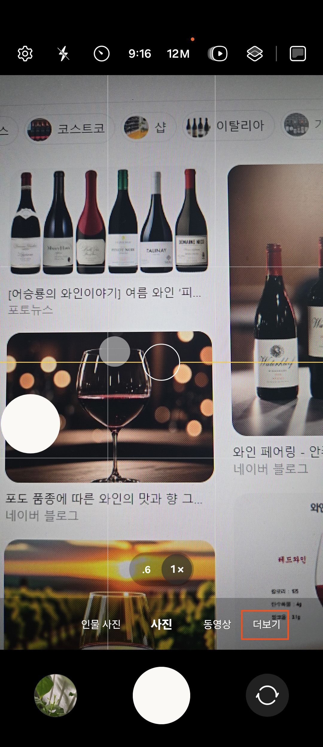 기본 카메라 앱 켜기 > 더보기 > 빅스비 비전 > 와인