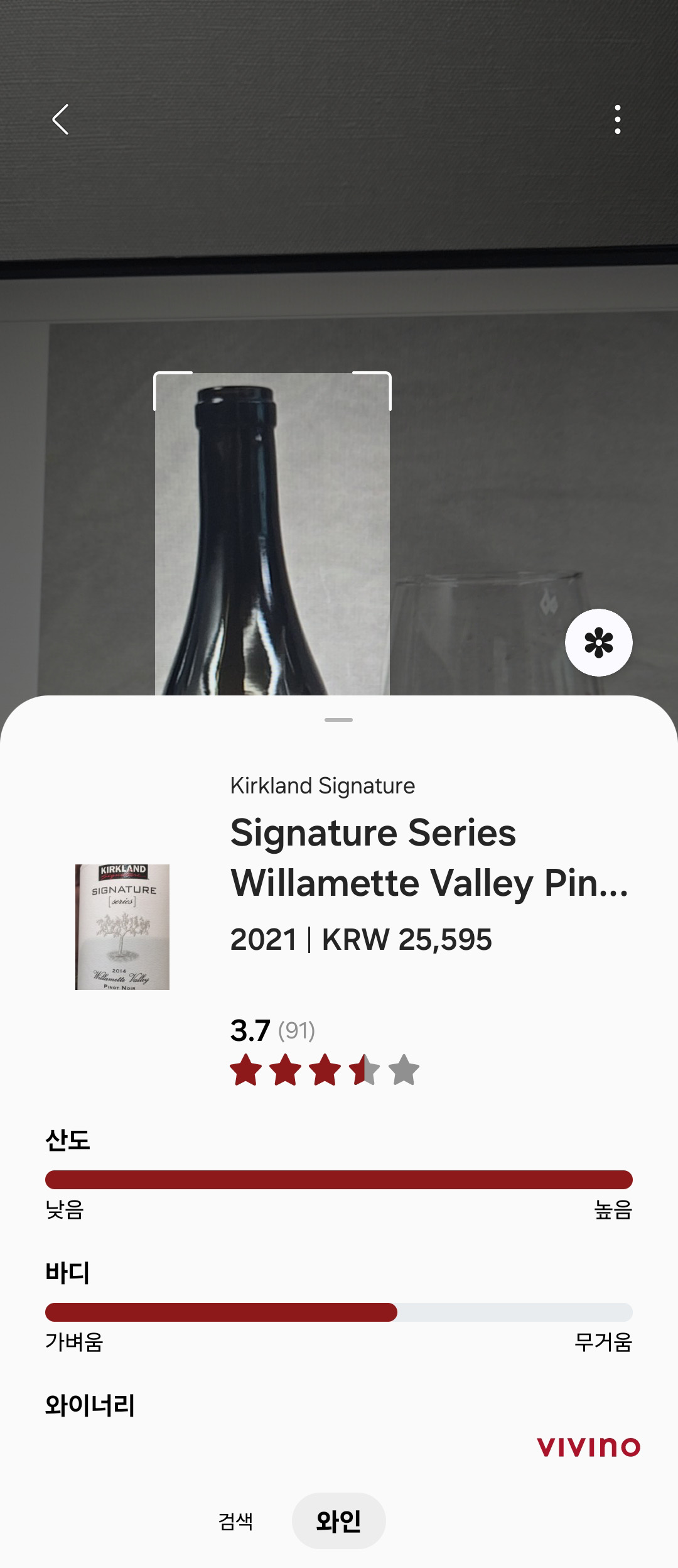 와인 검색에 성공하게 되면 다음과 같이 와인에 대한 정보를 얻으실 수 있습니다. 산도와 바디감, 가격은 물론, 별점까지 한 번에 확인할 수 있기 때문에 파티에서 와인에 대해서 잘 모른다면 카메라 앱을 사용해서 와인에 대해서 아는척을 할 수도 있습니다. 어차피 촬영을 할 필요는 없기 때문에 소리를 낼 필요도 없습니다.