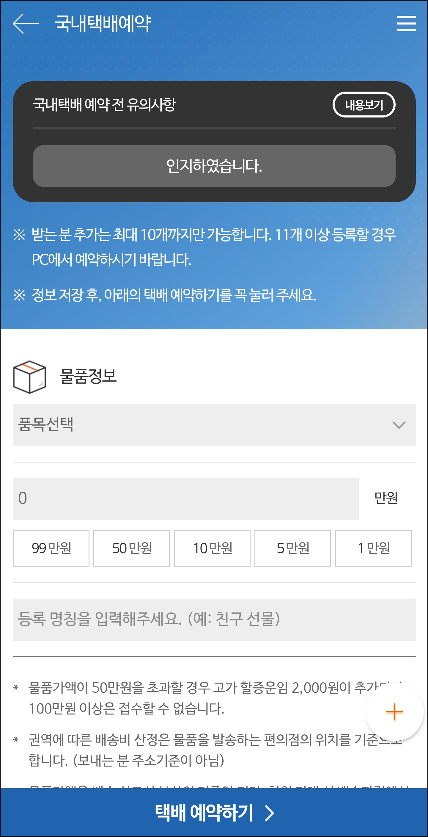 2. 반값, 국내, 국제 중 원하는 버튼을 클릭 후 주소 등을 기재하고 예약을 합니다.