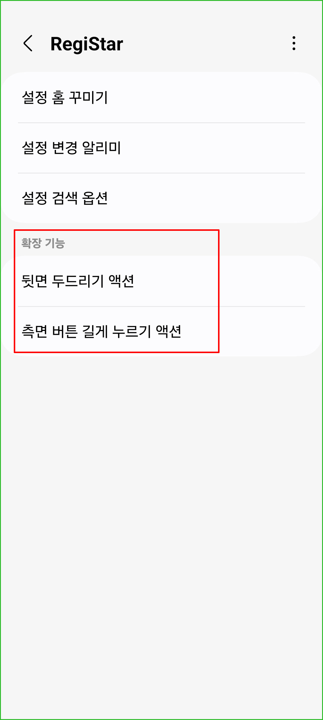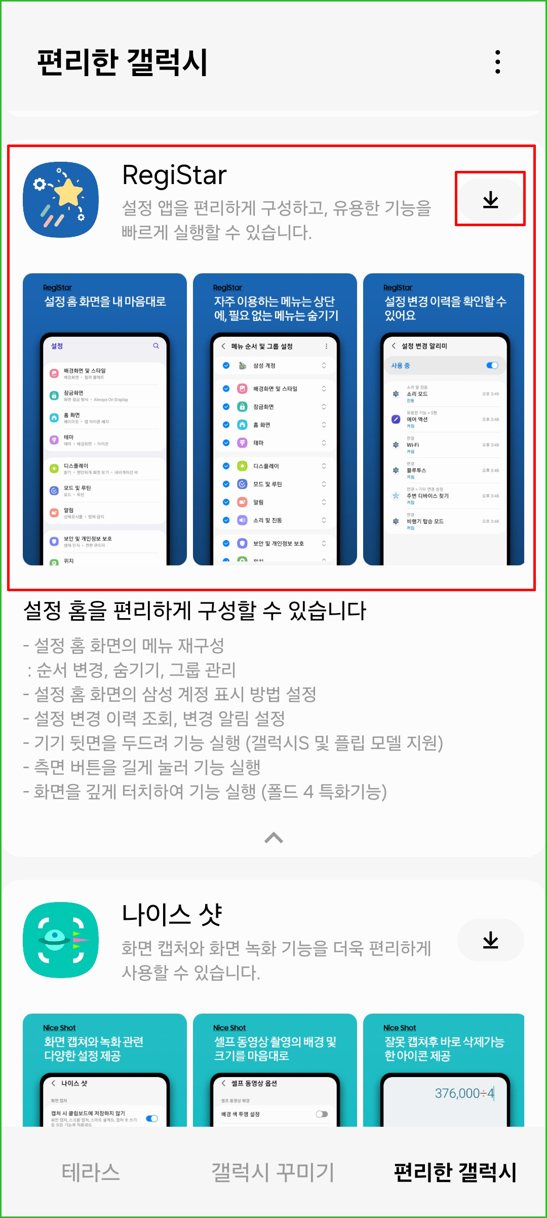굿락앱 내에는 여러가지 추가 앱들이 있습니다. 그 중 Registar를 클릭하여 다운로드 받습니다. Registar는 등록하다란 뜻으로 휴대폰 측면 버튼과 뒷쪽 두드리기 동작 시 원하는 앱이 실행되도록 설정할 수 있습니다. 말 그대로 앱을 일일이 찾을 필요 없이 단축키 느낌으로 측면 버튼을 길게 누르거나 휴대폰의 뒷쪽을 두 번 또는 세 번 두드리는 것만으로 앱을 실행 시켜 줍니다.