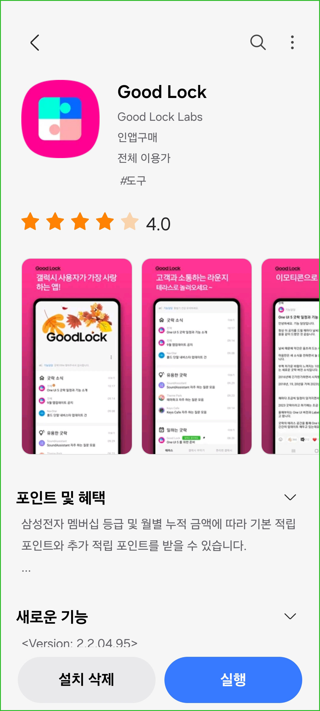 삼성 갤럭시 스토어 > 굿락 검색 > 실행 > 하단 편리한 갤럭시 클릭