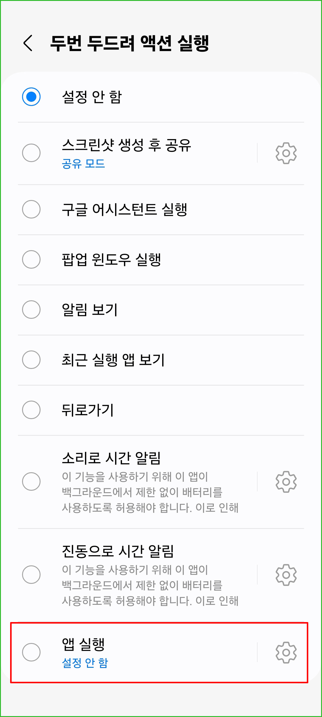 크게 뒷면 두드리기와 측면 버튼 길게 누르기가 있고, 뒷면 두드리기에는 두 번과 세번으로 나뉩니다. 그러니까 총 3개의 단축키를 설정할 수 있는 셈입니다. 원하시는 것으로 선택하시면 되는데, 녹음기의 경우 아무래도 소리가 나는 두드리기 보다는 측면버튼(전원버튼)을 길게 누르면 앱이 실행되도록 하는 것이 더 나을 수 있습니다.