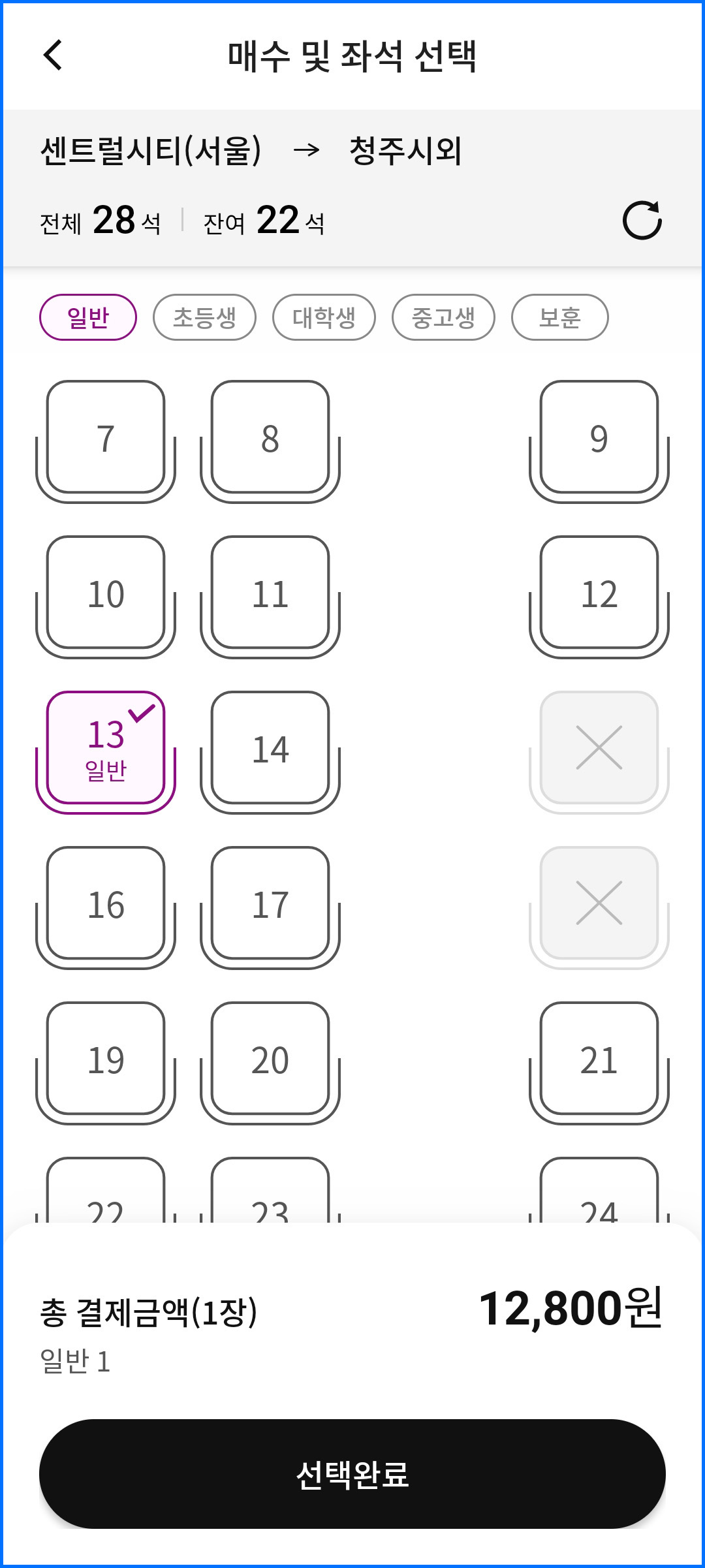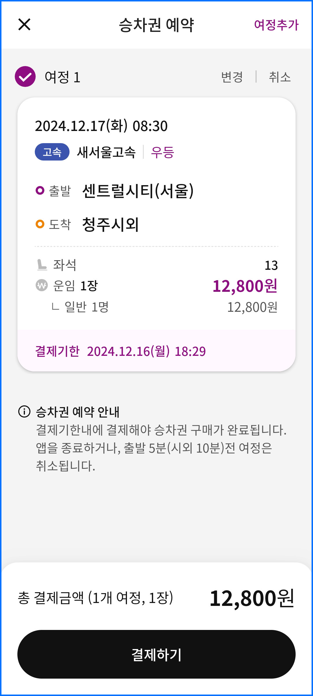 이제 원하는 좌석을 선택하세요. 1인석이나 창가쪽 등 원하는 번호를 선택하시면 됩니다. 좌석을 선택 후 선택완료를 누르시면 최종적으로 출발/도착지 확인과 가격 등을 확인하실 수 있습니다. 내용이 맞다면 결제하기를 눌러 승차권을 구입하시면 됩니다.