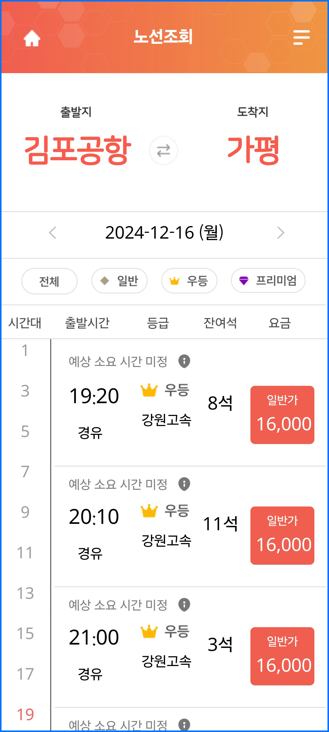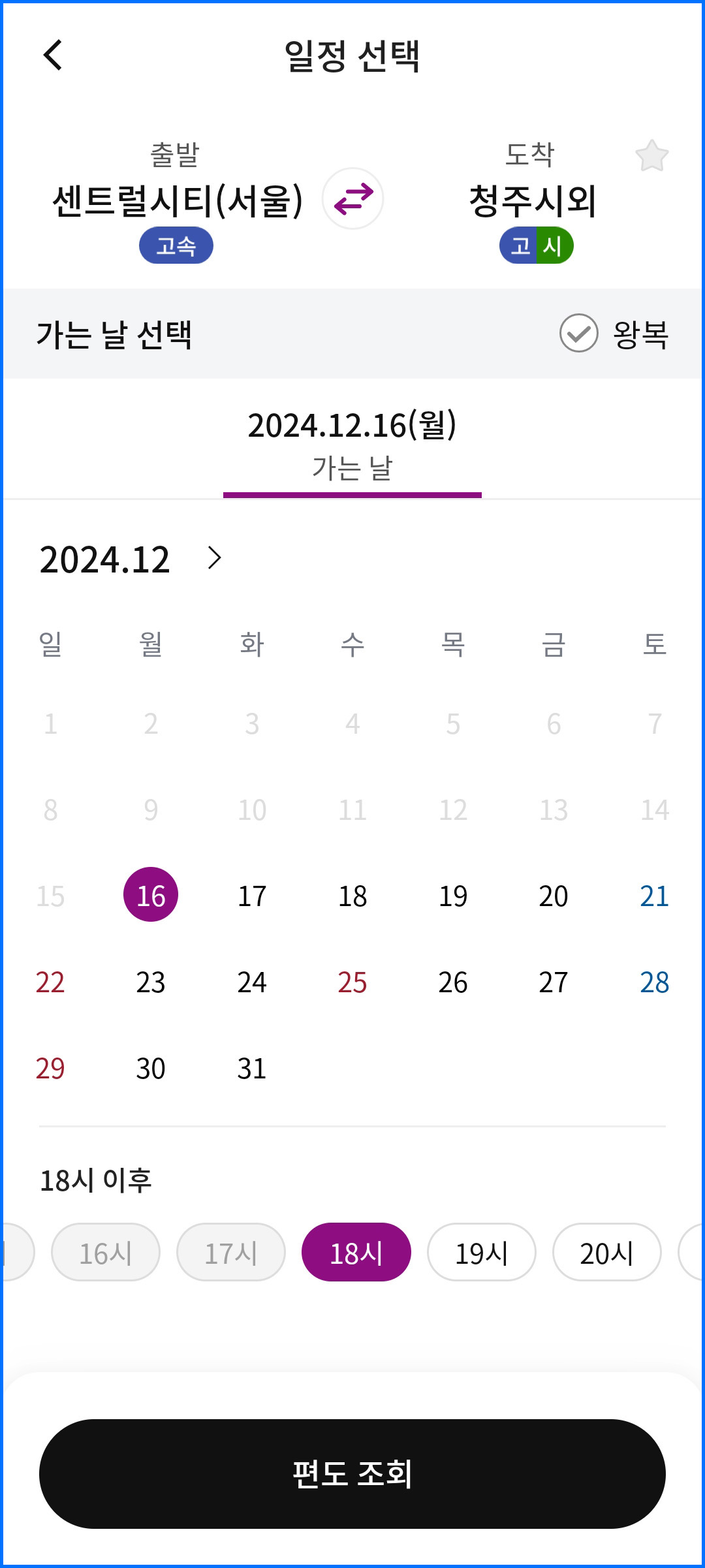출발지와 도착지를 선택하시면 날짜를 선택하실 수 있는데, 달력 형태로 되어 있어 한 눈에 보기에 좋게 되어 있습니다. 날짜를 선택 후 시간을 선택해 주시면 되는데, 가장 빠른 시간으로 선택을 하시면 전체 시간표를 확인하실 수 있습니다.