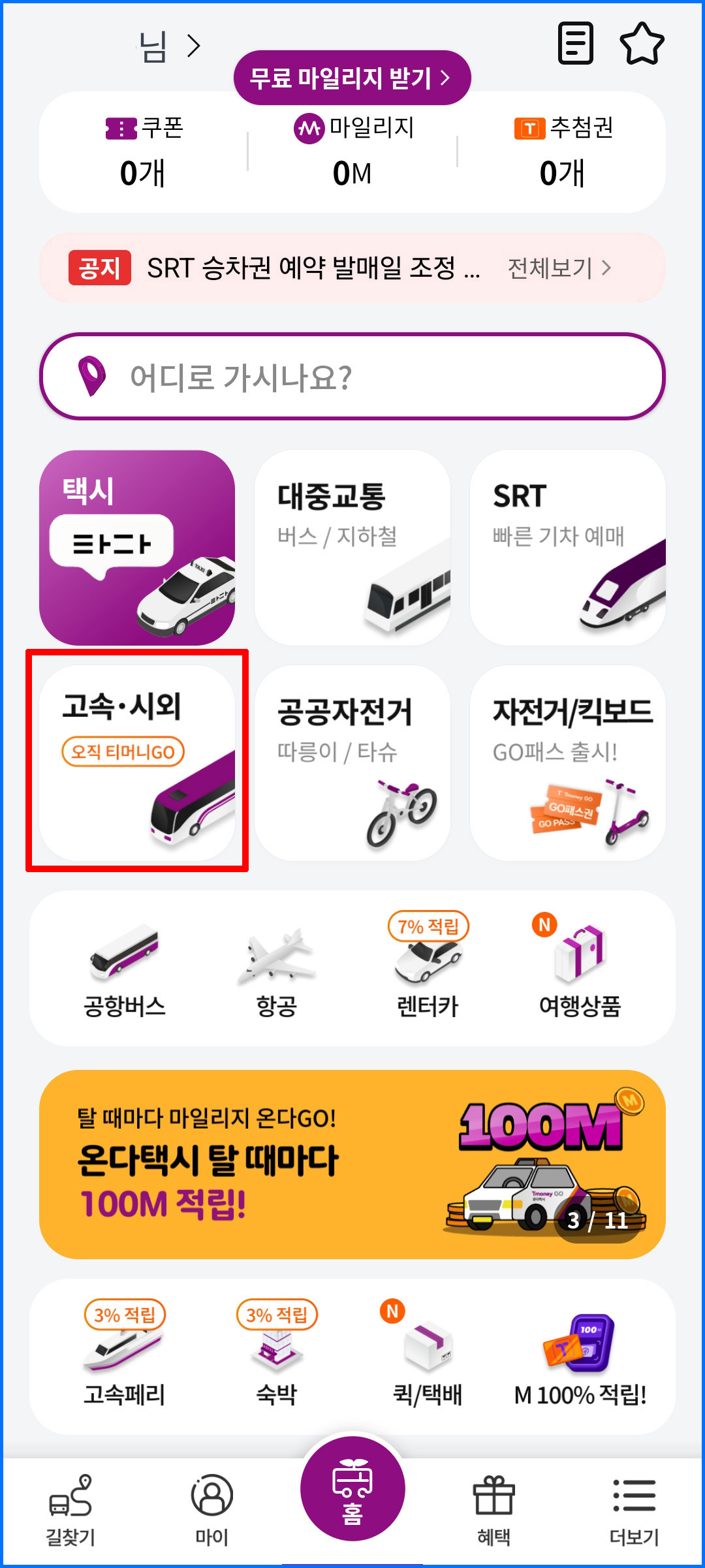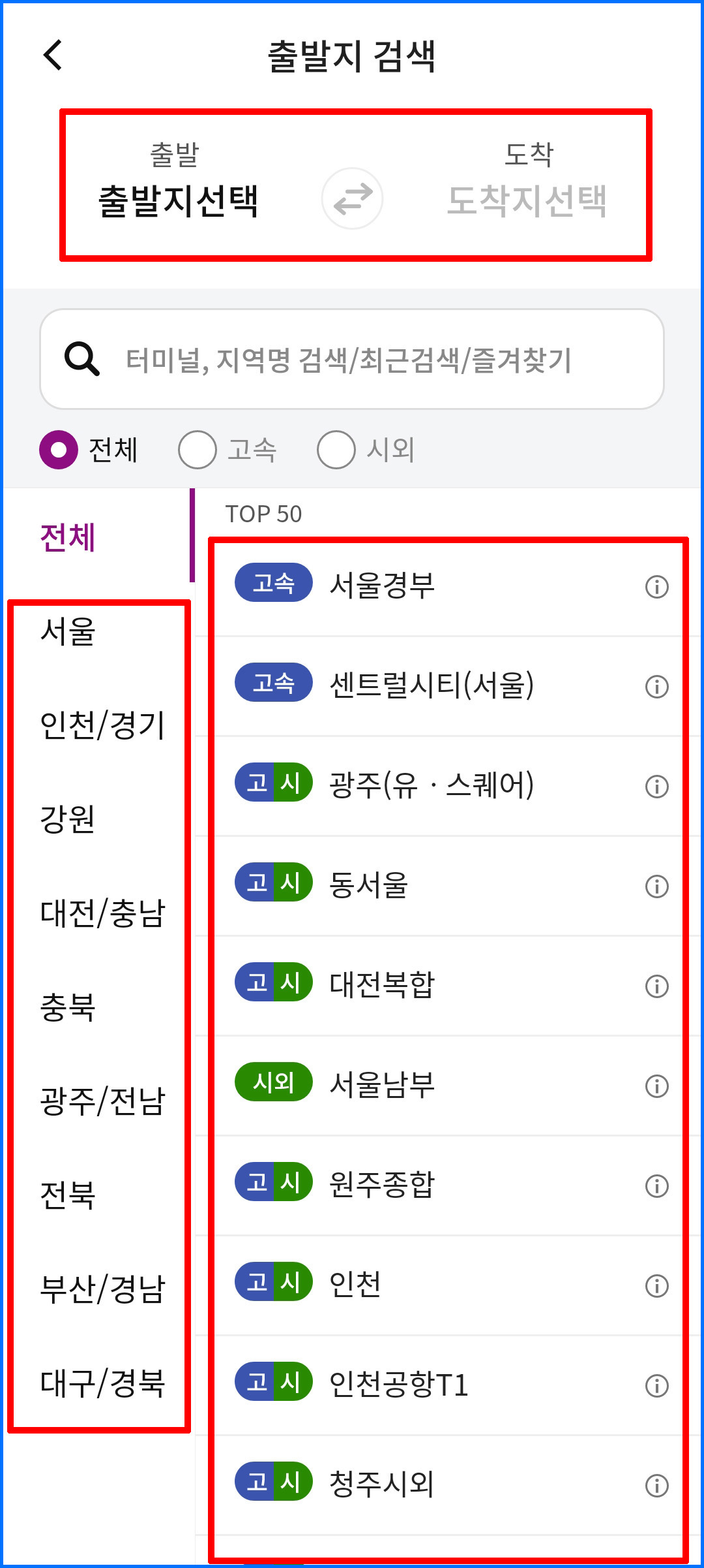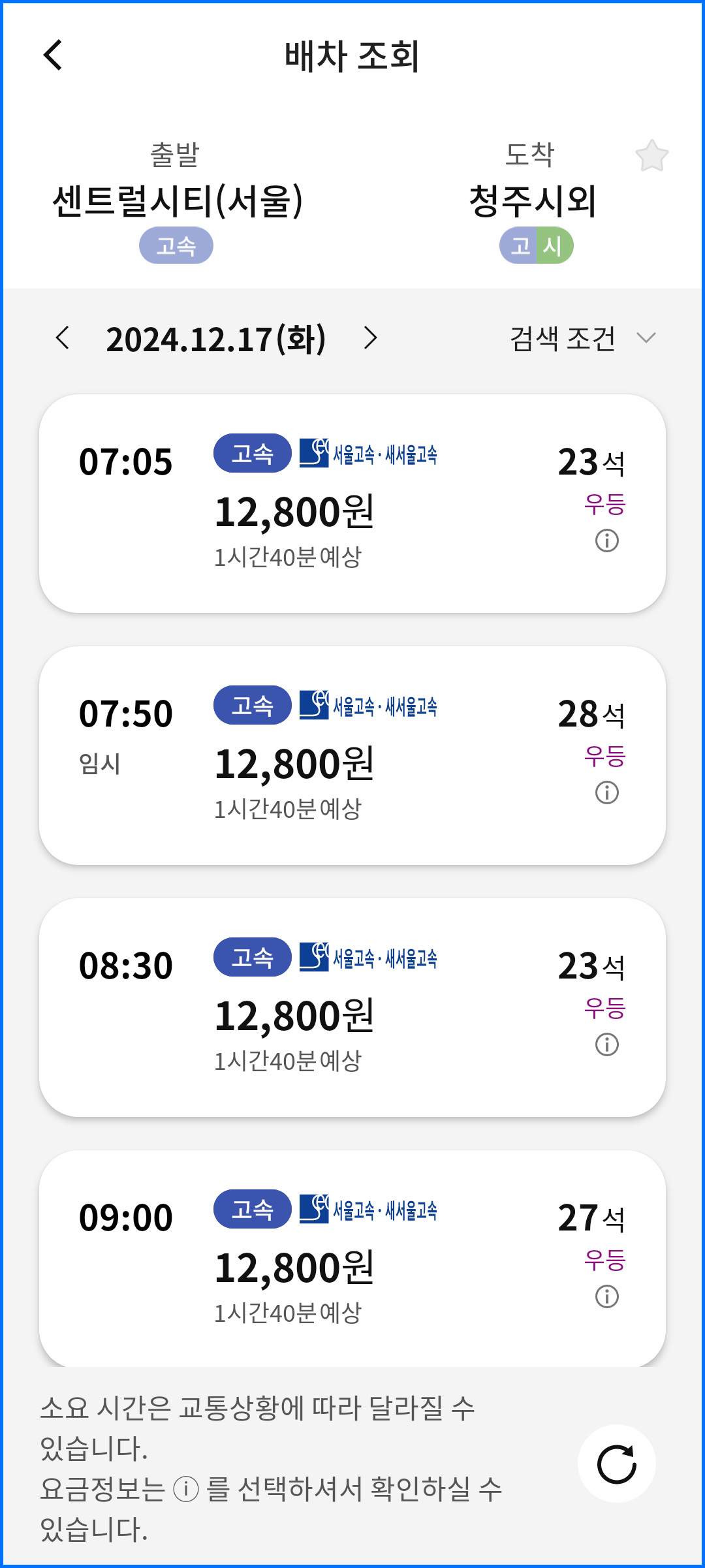 티머니 GO의 장점은 고속버스와 시외버스를 동시에 찾아볼 수 있다는 점입니다. 고속버스와 시외버스는 터미널이 서로 다를 때도 있어 예전에는 앱을 두 개를 따로 설치하고 확인했어야 했는데, 통합되어 아주 편리하게 사용할 수 있습니다.