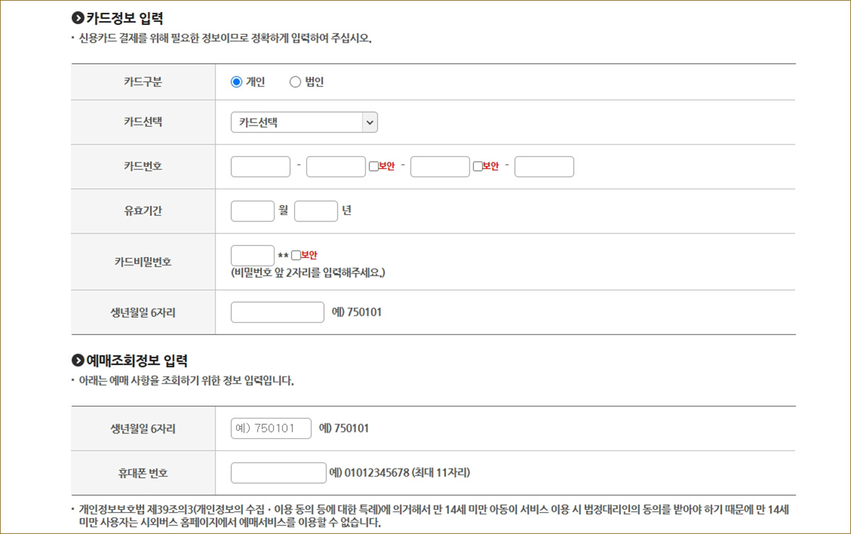 5️⃣ 결제 정보 입력 후 예매하기 버튼을 눌러 예매 완료하기