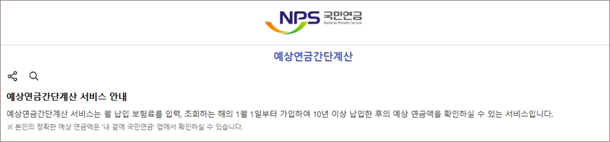* 해당 예시는 대략적인 계산 방식으로 실제 연금액과는 차이가 있을 수 있음으로 '국민연금공단'에서 제공하는 "국민연금 예상연금액 조회" 서비스를 통해 확인해 보시길 바랍니다.