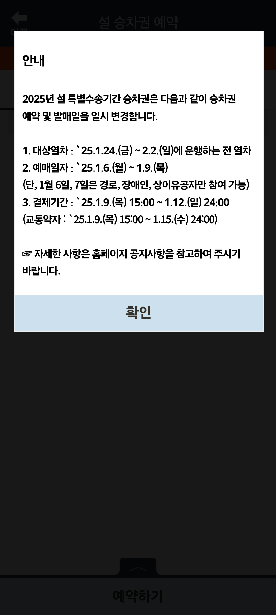 1️⃣ 경로·장애인·국가유공자(교통지원대상) 우선 예매- 날짜 시간 : 2025년 1월 6일(월) 오전 9시 ~ 오후 3시