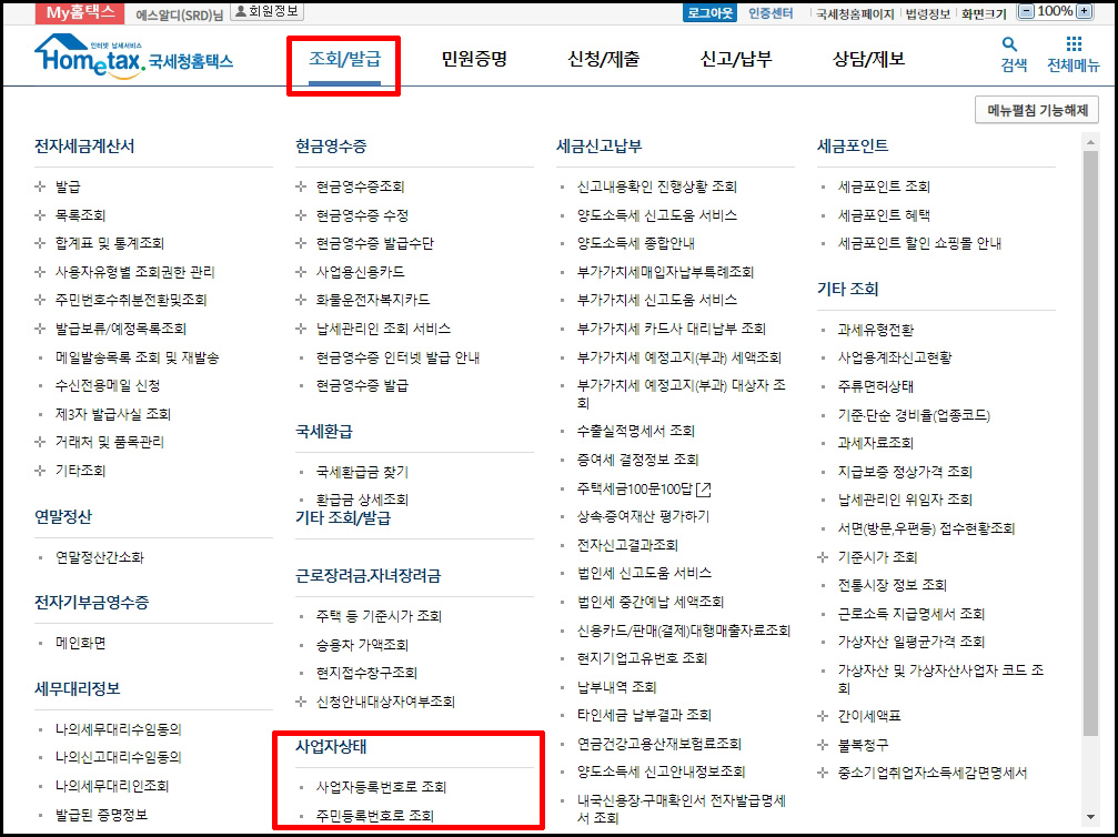 조회/발급 > 사업자 상태(사업자등록번호로 조회 or 주민등록번호로 조회)