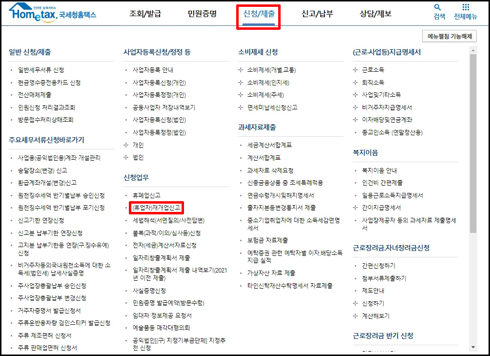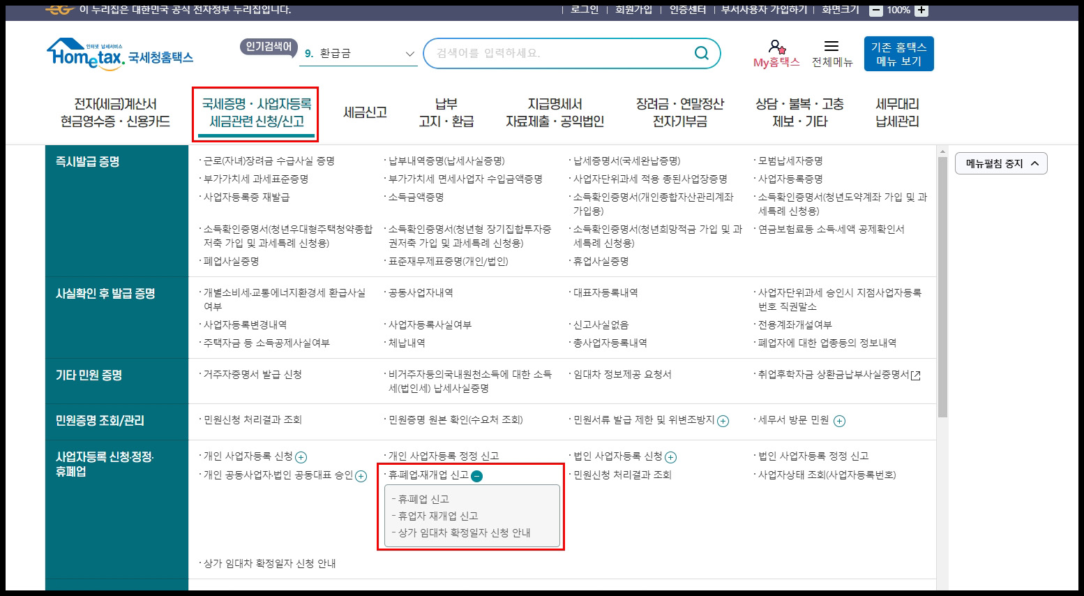 휴업 기간 중에 재개업을 하고자 하는 경우 역시 국세청 홈택스의 메뉴를 통해 신고할 수 있습니다.