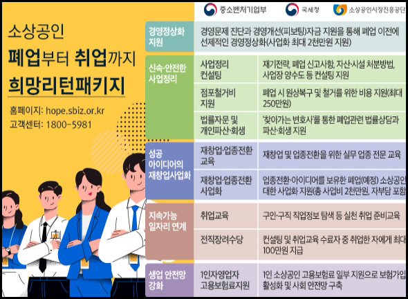 휴업은 말 그대로 잠시 쉬었다가 다시 사업을 재개하게 됨으로 관련이 없지만, 폐업은 새로운 일자리를 찾아야 하고, 폐업 시 처리해야 할 것들이 많이 있을 수 있기 때문에 정부에서 지원 사업을 진행하고 있습니다.