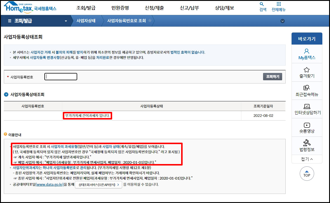 휴업기간이 지났다면 사업자등록 상태 조회를 통해 휴업인지 재개되었는지 알 수 있습니다.