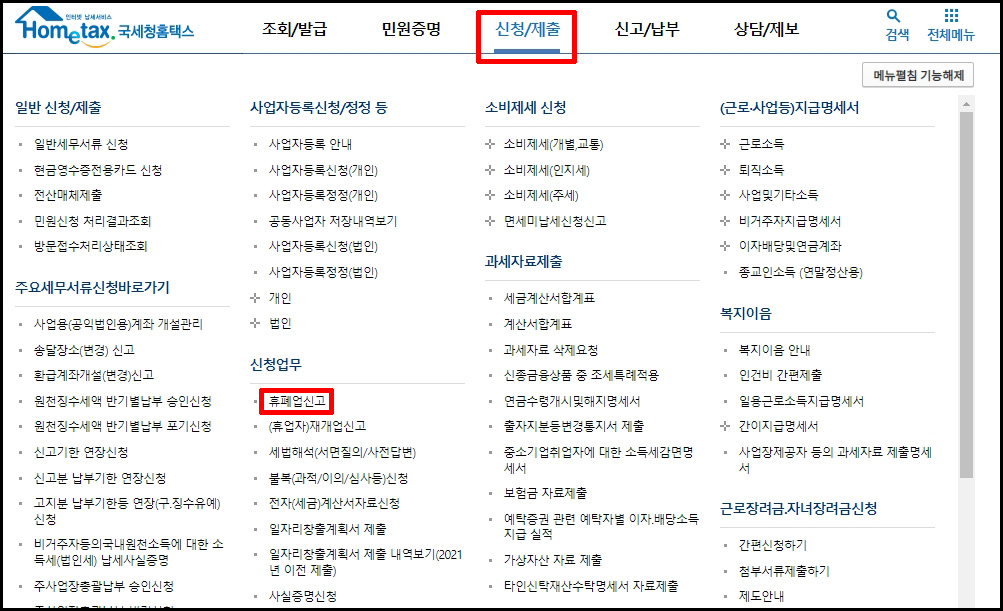 국세청 홈택스 접속 > 로그인 > 신청/제출 > 휴폐업신고