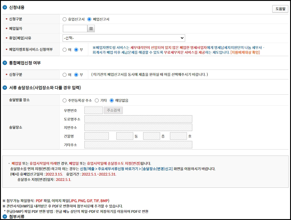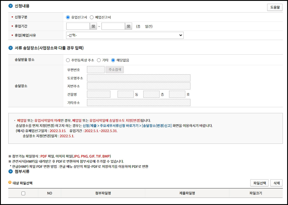 휴업 또는 폐업의 날짜, 사유 등을 간단하게 작성하여 신고하면 처리가 됩니다.
