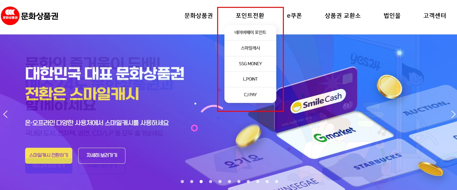 컬쳐랜드가 아닌 문화상품권 기프트로 이동합니다. 상단 메뉴에 보시면 포인트 전환이 있는데, 5가지의 포인트 전환을 지원하고 있습니다.