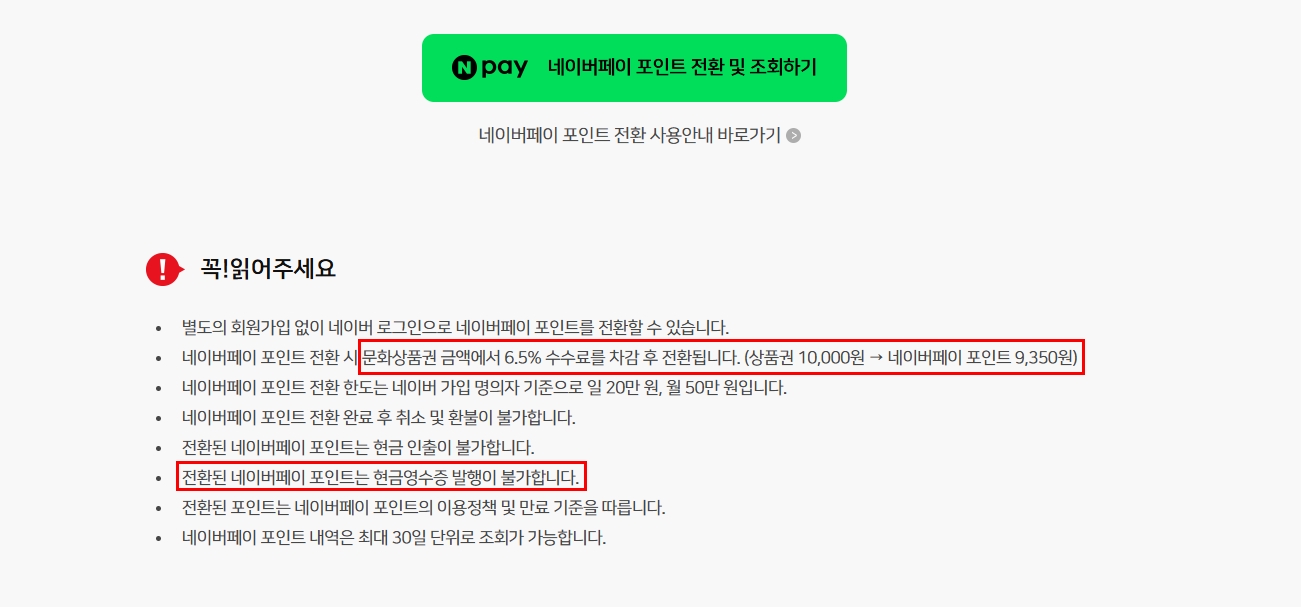 네이버 포인트로 전환하게 될 때 불이익이 좀 있습니다. 수수료가 존재한다는 점이고, 현금영수증 발행이 불가하다는 점입니다. 그런데 딱히 문화상품권을 사용할 일이 없다면 포인트 전환이 나을 수도 있습니다. 그리고 저 같은 경우에는 책을 사려고 했는데, 충전이 되질 않아서 해당 방법으로 시도했는데.. 수수료가 아깝긴 했습니다.