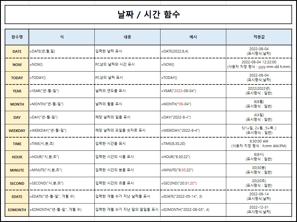 ▲ MS 엑셀 날짜 시간 함수 정리 파일 : 다운로드