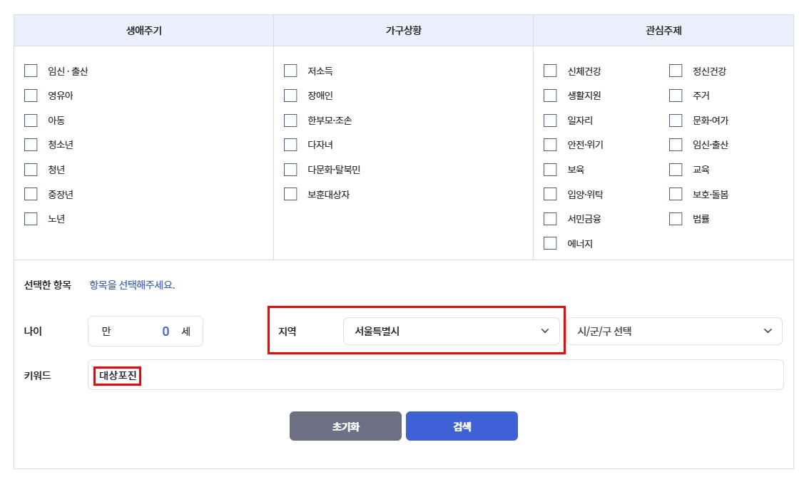복지서비스 > 서비스 찾기 > 서비스 목록 > 살고 있는 지역 체크 > 키워드 '대상포진' 입력 > 지자체 정책 확인