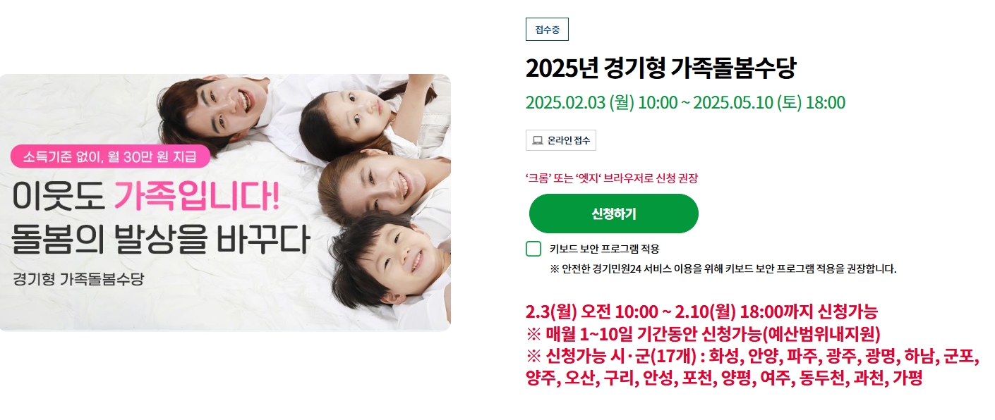 이미 많은 분들이 신청했습니다. 당신 차례입니다! 5분이면 끝! 놓치면 후회할 수당, 지금 바로 신청하세요!경기형 가족돌봄수당이란?