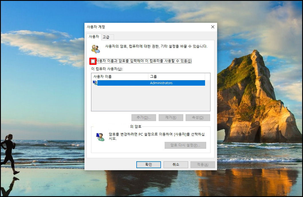 '사용자 이름과 암호를 입력해야 이 컴퓨터를 사용할 수 있음(E)' 앞에 네모칸이 체크되어 있다면 해제해 줍니다.