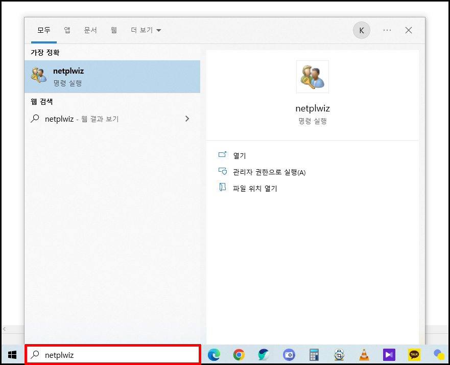 좌측 하단의 윈도우 버튼 옆에 'netplwiz'를 입력합니다.