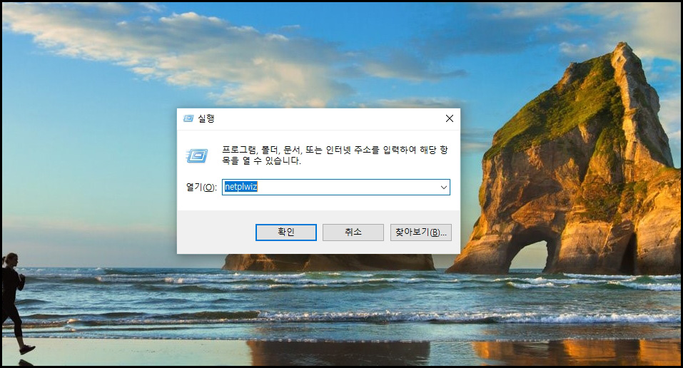 혹은 윈도우 키 + R을 입력 후 실행 창에 'netplwiz'를 입력해 주면 됩니다.