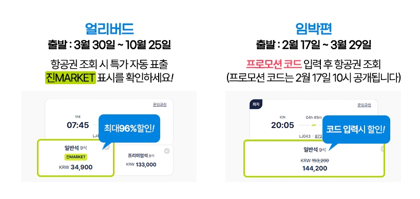 얼리버드 항공권 : 항공권 검색 시 ‘JIN MARKET’ 표시된 티켓 선택