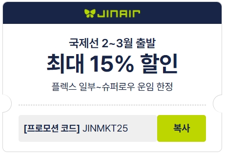 임박편 항공권 : ‘프로모션코드’ 입력 후 항공권 조회 (코드는 2월 17일 10시 공개)진에어 진마켓 특가 노선
