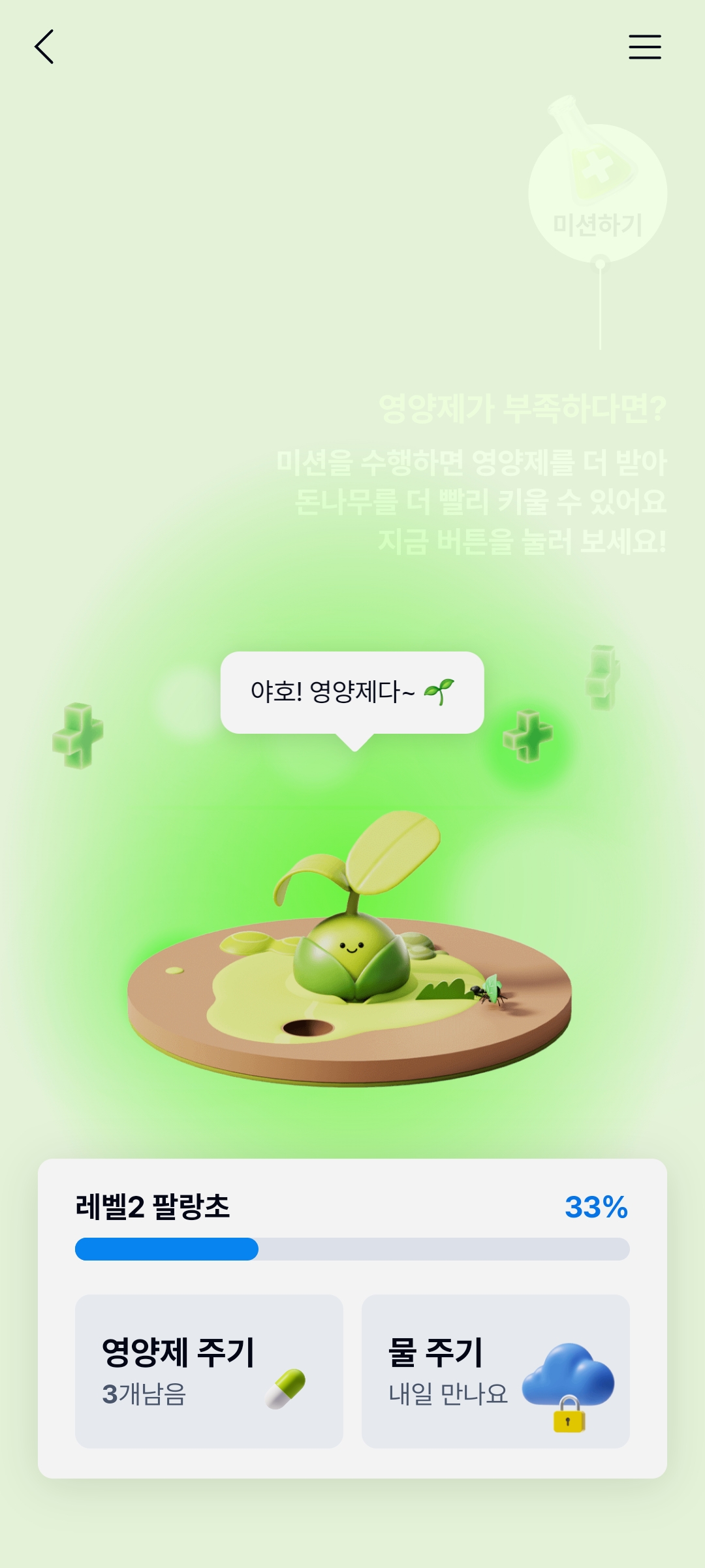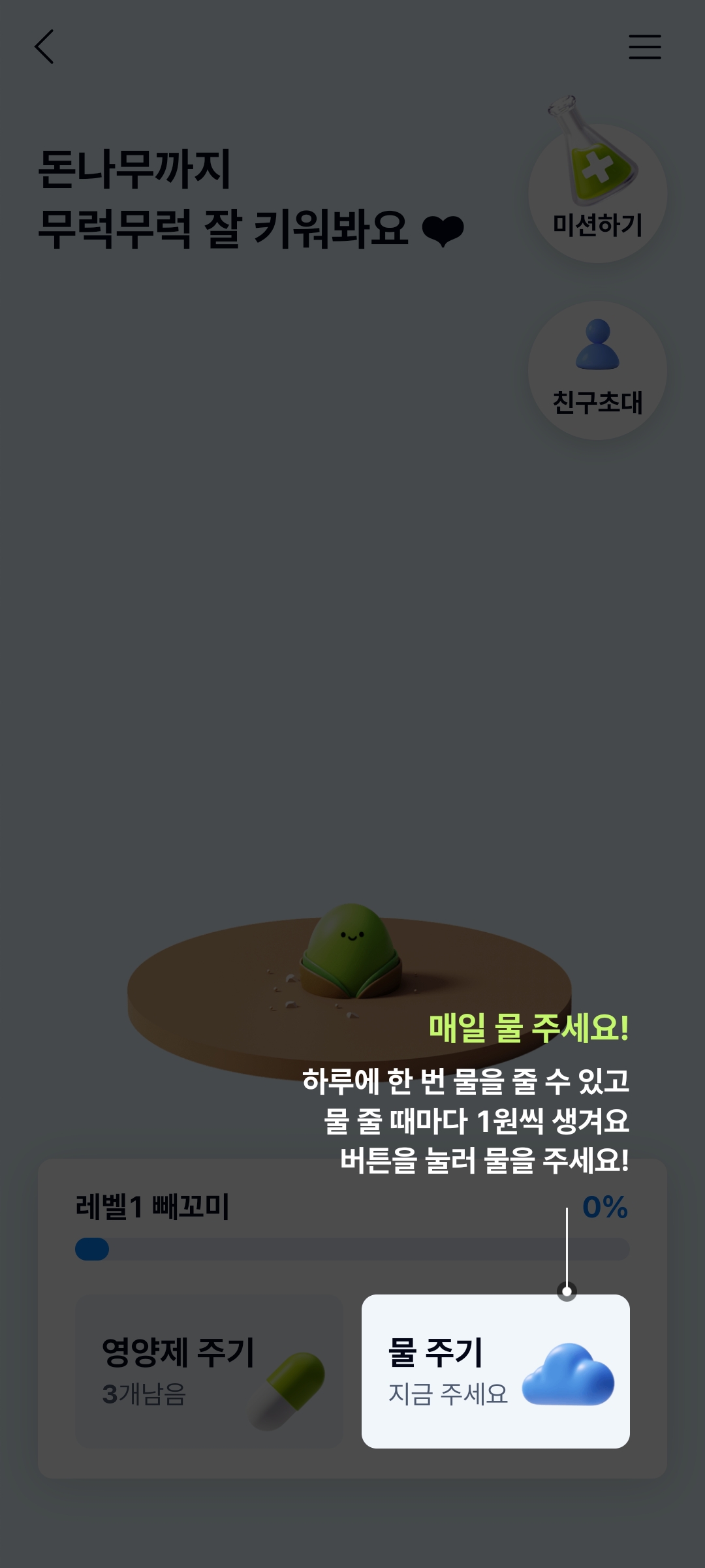 조금이라도 빠르게 성장 시키고 싶다면, 영양제와 물 주기를 잘 활용해야 합니다. 물주기는 하루에 한 번 뿌려주고 1원을 받는 것이 고작이지만.. 영양제는 미션을 통해 추가로 획득할 수 있습니다.