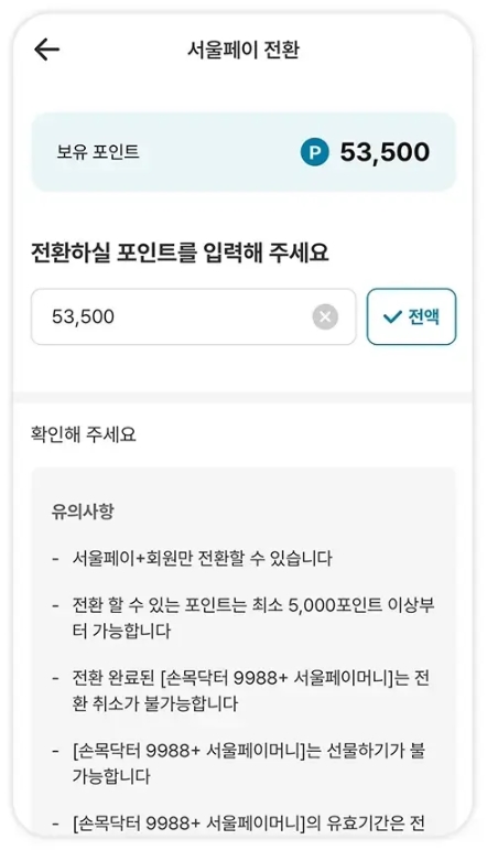 4️⃣ 서울페이머니 전환 : 포인트를 서울페이머니로 바꿀 수 있습니다. 5,000포인트 이상이어야 전환이 가능합니다.