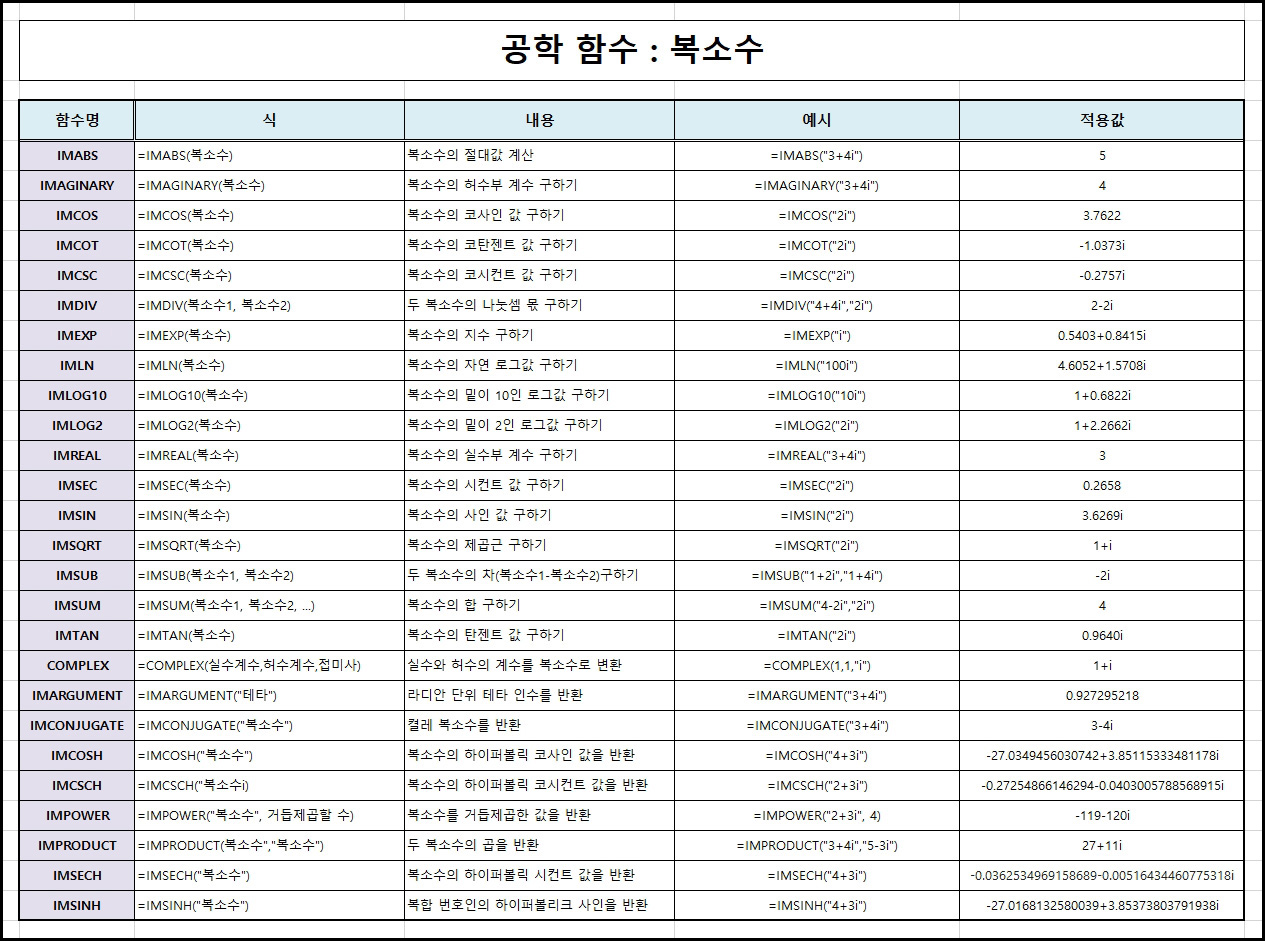 👉 복소수 함수가 정리된 엑셀 파일은 하단에 있습니다.